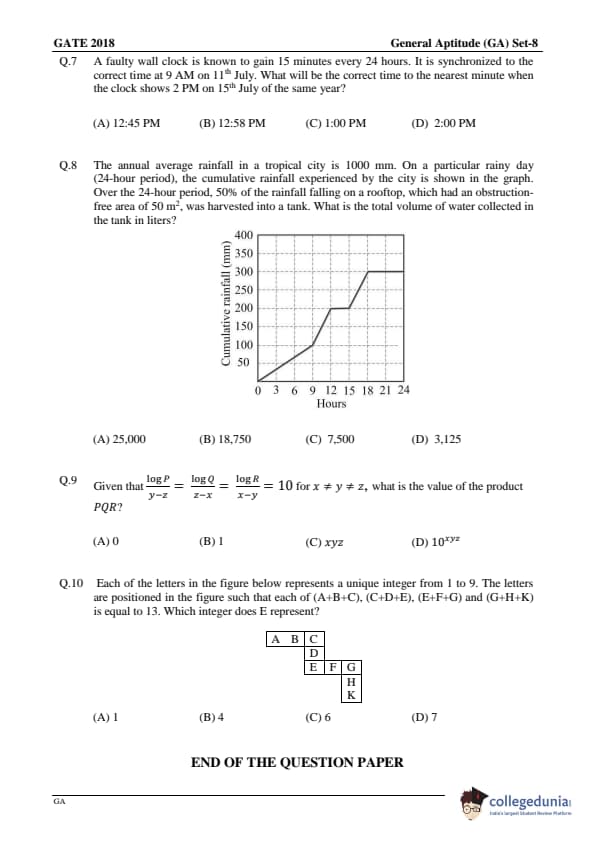 - In General Aptitude, question number 1 to 5 carries 1 mark and Question number 6 to 10 carries 2 marks. In total, the GATE CE 2018 Set 2 paper has 65 questions.