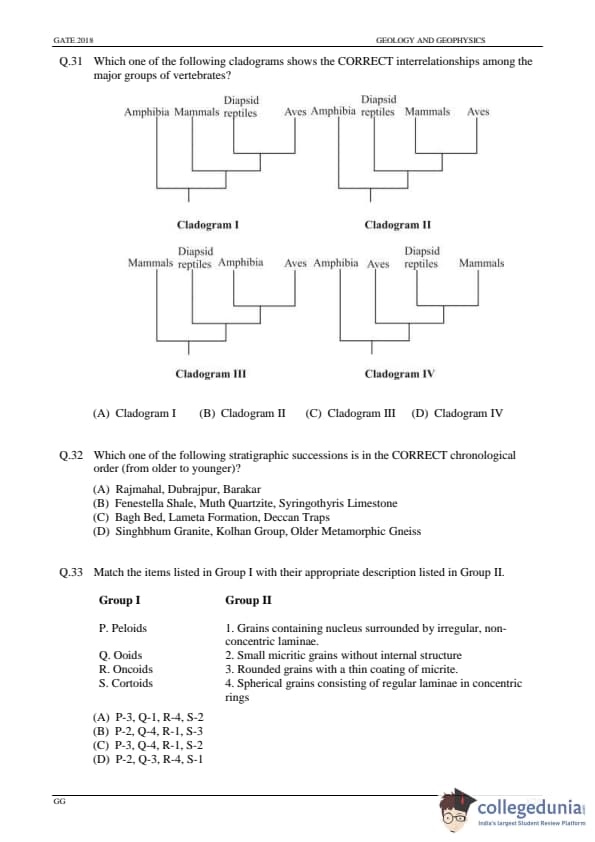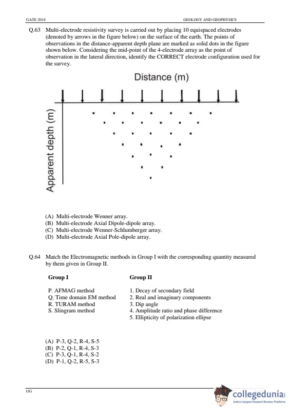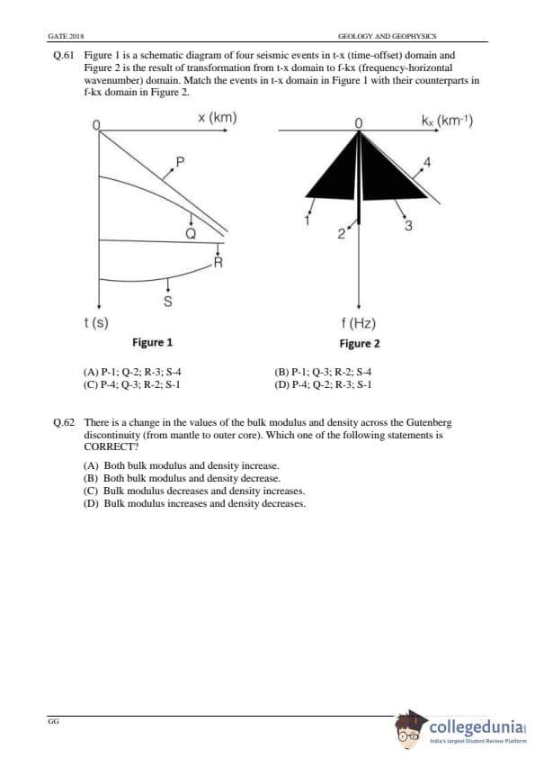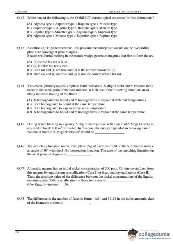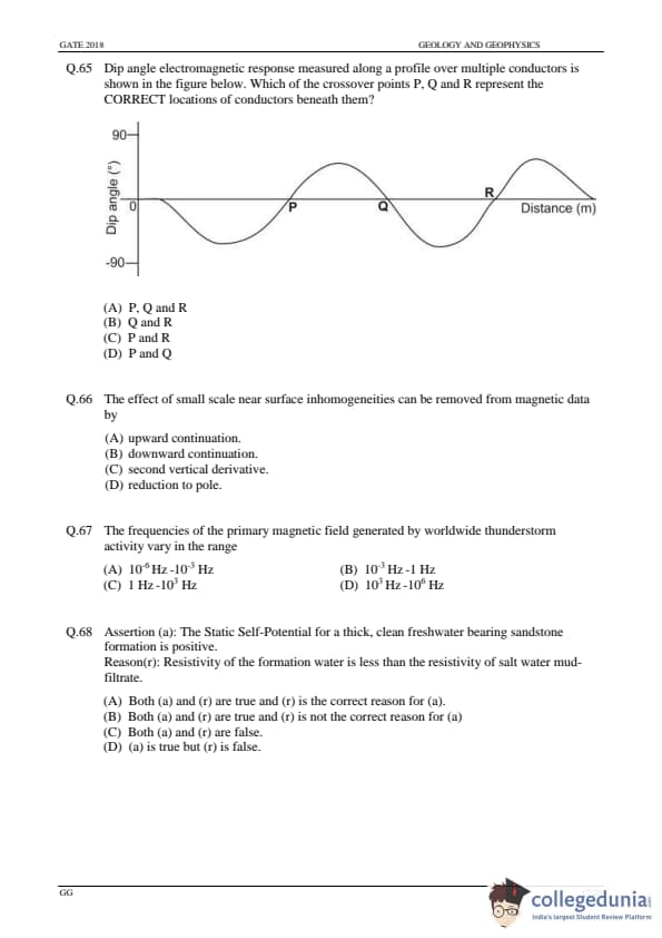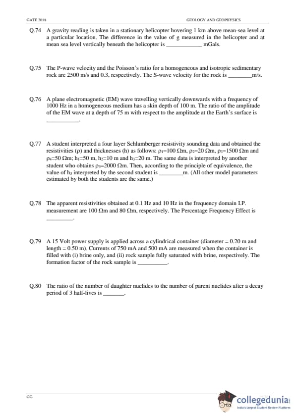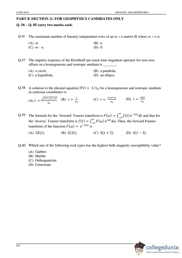 GATE 2018 GG Question Paper with Answer Key PDF is available for download. The exam was conducted by IIT Guwahati on February 4, 2018. The paper has 65 questions, which include questions related to comprehension, General Aptitude, Applications, and Analysis and synthesis. GATE GG 2018 was a 3-hour duration exam with a total of 100 marks. The questions in GATE 2018 GG were divided into 2 parts. The Part B of the paper has 2 sections out of which a candidate is allowed to attempt either Geology questions or Geophysics questions. Aspirants preparing for GATE GG can practice the previous year papers using the links provided.