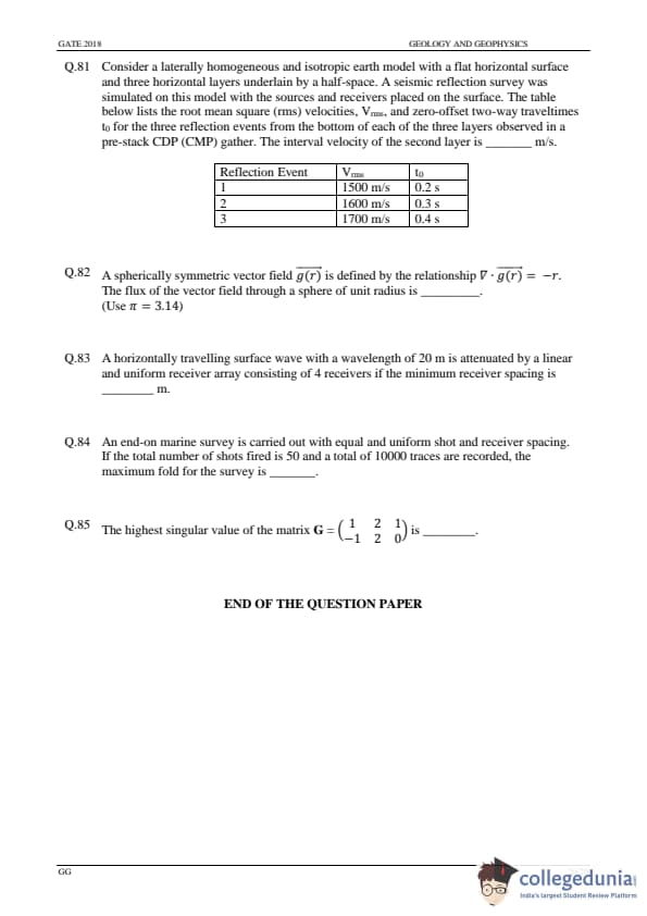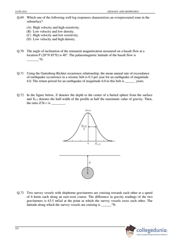 - The Part B of GATE 2018 GG has questions purely based on Geology and Geophysics such as Geomorphic processes and agents; development and evolution of landforms; slope and drainage; processes in deep oceanic and near-shore regions; quantitative and applied geomorphology, Basic concepts of forward and inverse problems, Ill-posedness of inverse problems, condition number, etc.