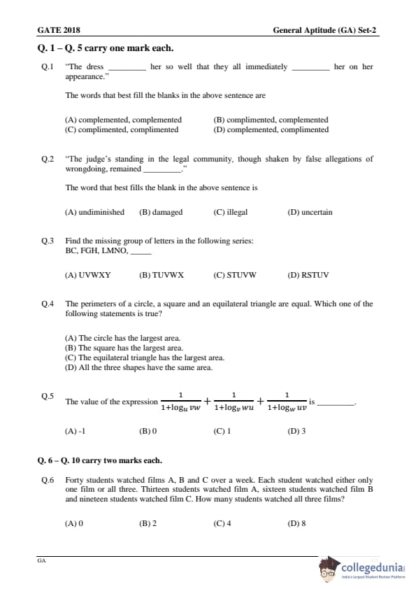 - In the GATE MA 2018 paper, there were 10 General Aptitude questions in which 5 questions carried 1 mark each and 5 questions were of 2 marks each.