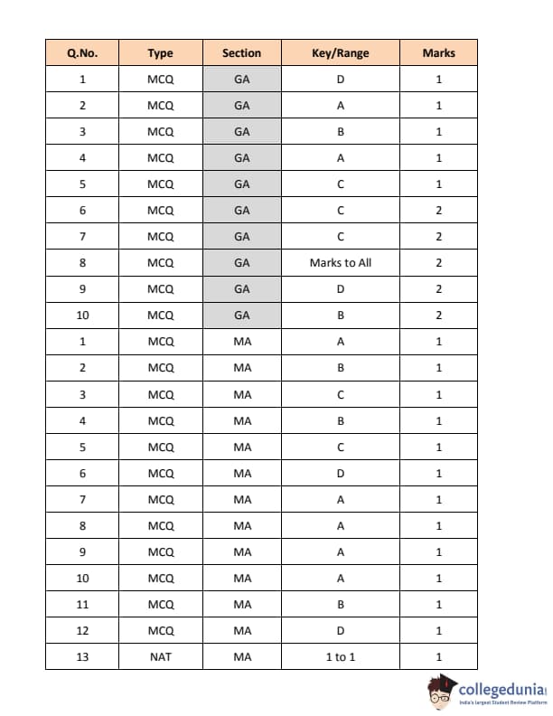 Candidates can check the number of 1 mark and 2 marks questions in GATE 2018 MA Question Paper from the table below-