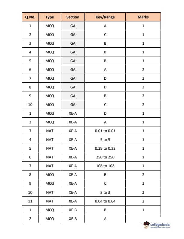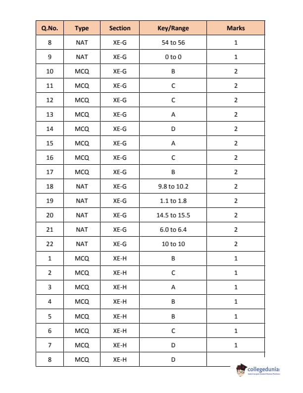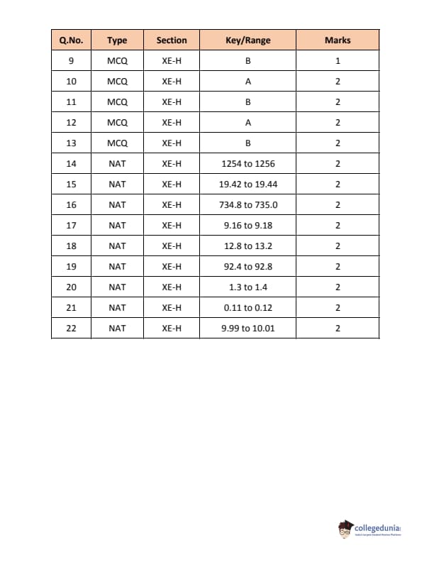 GATE 2018 XE had 8 sections. General Aptitude and Section A (Engineering Mathematics) are compulsory sections while candidates must choose any TWO from Section B-H of GATE XE paper. These sections are Fluid Mechanics, Materials Science, Solid Mechanics, Thermodynamics, Polymer Science & Engineering, Food Technology, and Atmospheric & Oceanic Science. The paper code for these sections was XE-A, XE-B, XE-C, XE-D, XE-E, XE-F, XE-G, and XE-H respectively. Section XE-A had 21 questions in total. Out of 21 questions, 14 were MCQs and 7 were NATs. Section XE-B to XE-H had 22 questions each.
