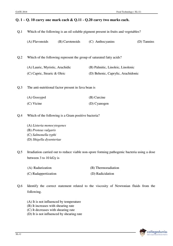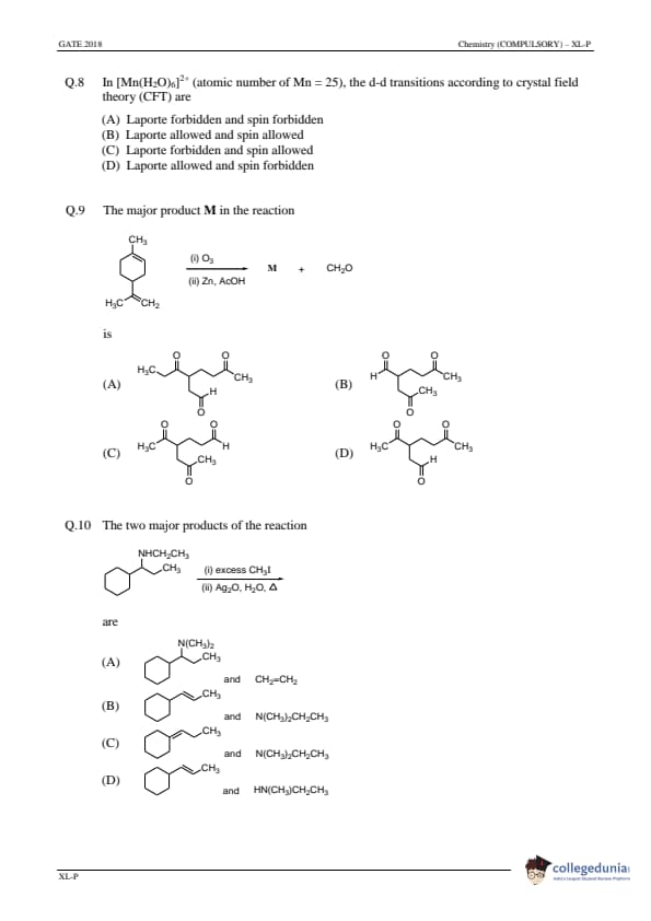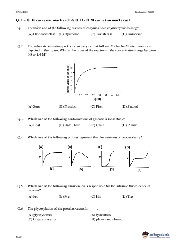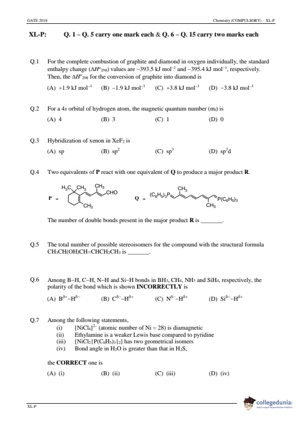 GATE 2018 XL Question Paper had 6 sections- Chemistry, Biochemistry, Botany, Microbiology, Zoology, and Food Technology. The paper code for these sections were XL-P, XL-Q, XL-R, XL-S, XL-T, and XL-U respectively. The Chemistry section and General Aptitude were compulsory section while candidates were required to choose and two from the other sections. Section XL-P had 25 questions in total. Section XL-Q to XL-U had 20 questions each.