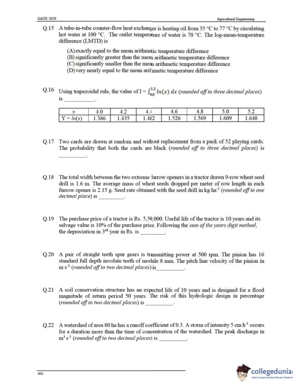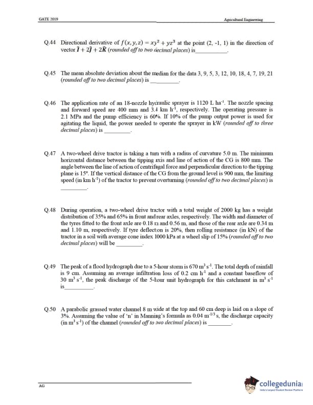 GATE 2019 Agricultural Engineering (AG) Question Paper with Answer Key pdf is available for download. The exam was conducted by IIT Madras on Feb-03 in the Afternoon Session. The question paper comprised a total of 65 questions from General Aptitude and Agricultural Engineering (AG) topics.