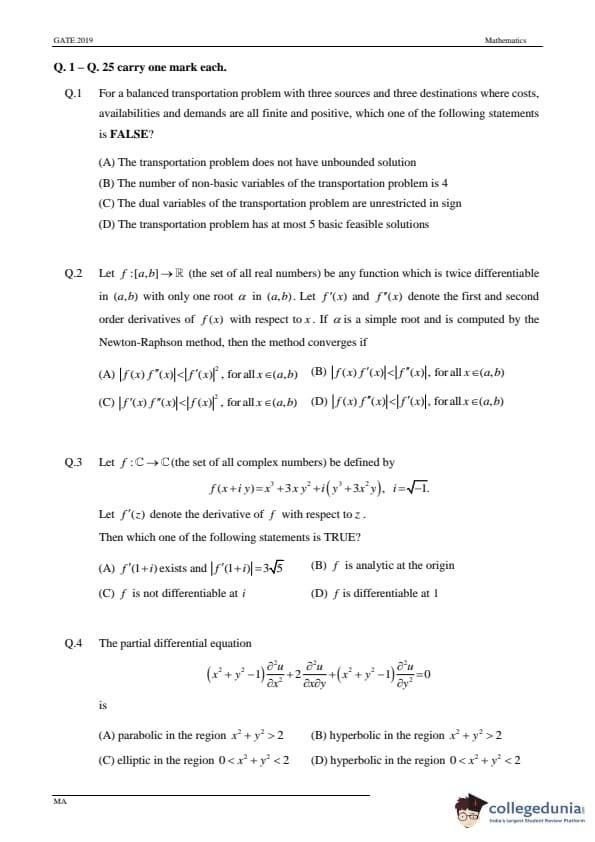 - Linear Algebra, Calculus, Green’s Theorem, Complex Analysis, Topology, and Numerical Analysis were the important topics asked in GATE 2019 MA Question Paper.