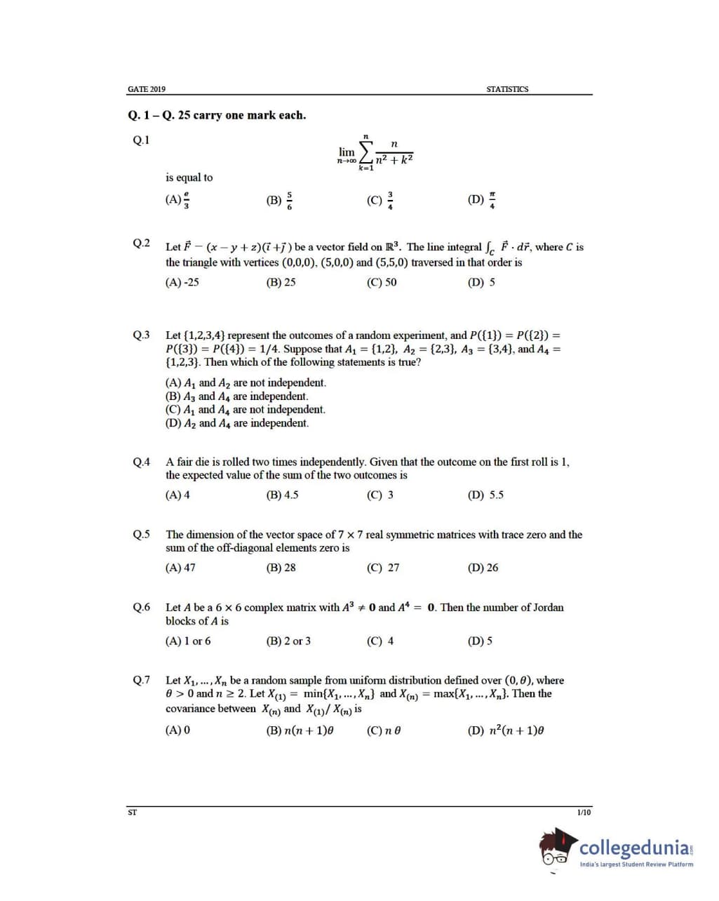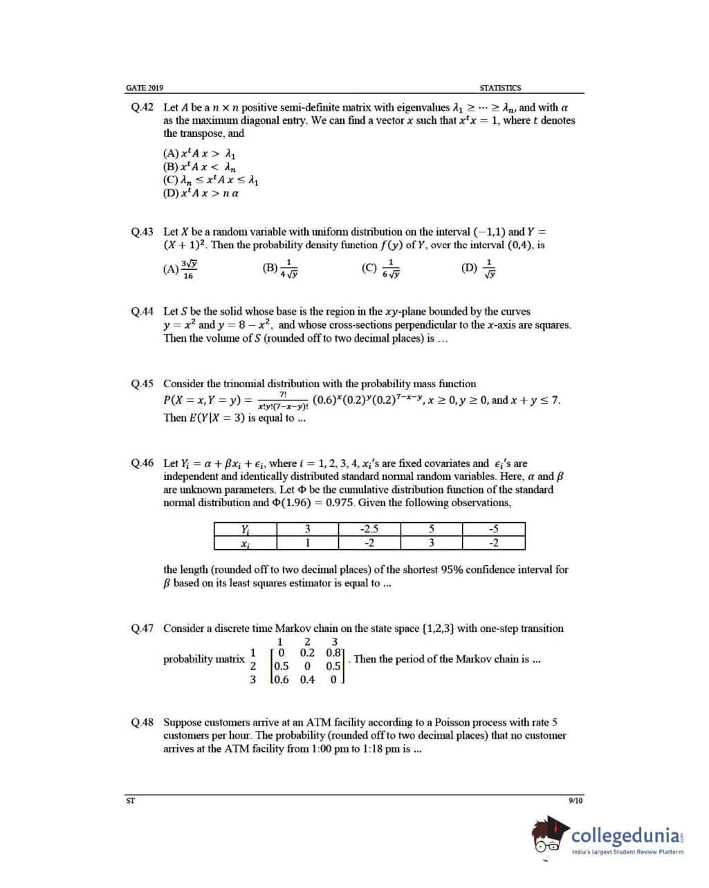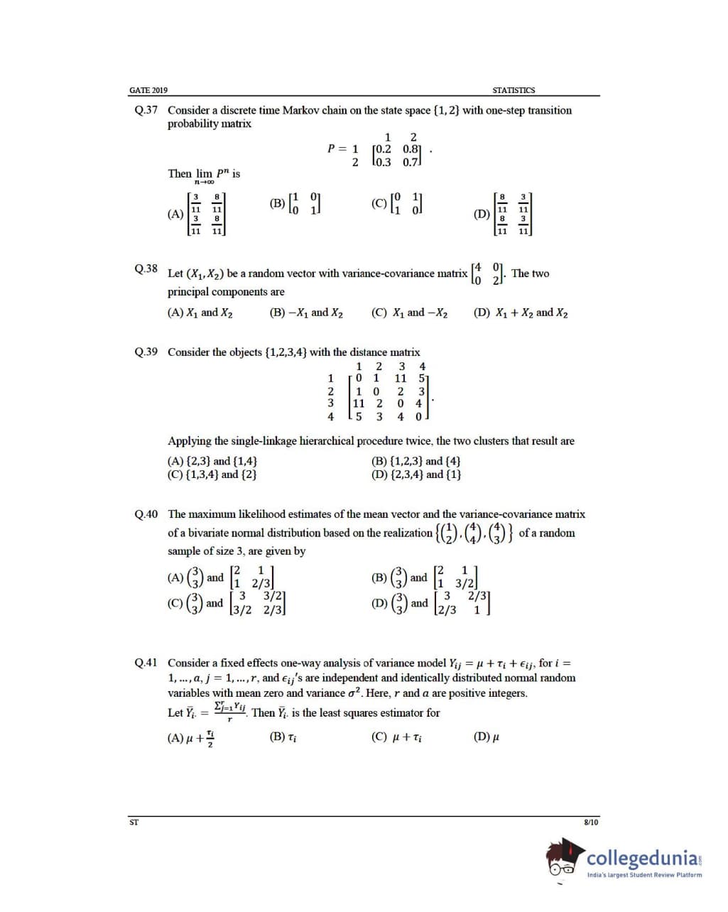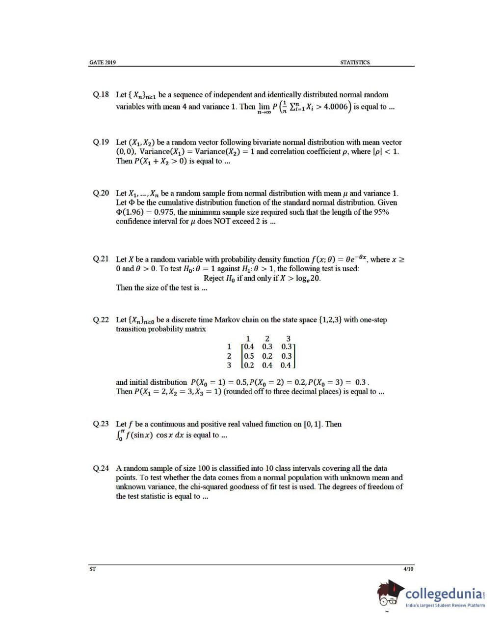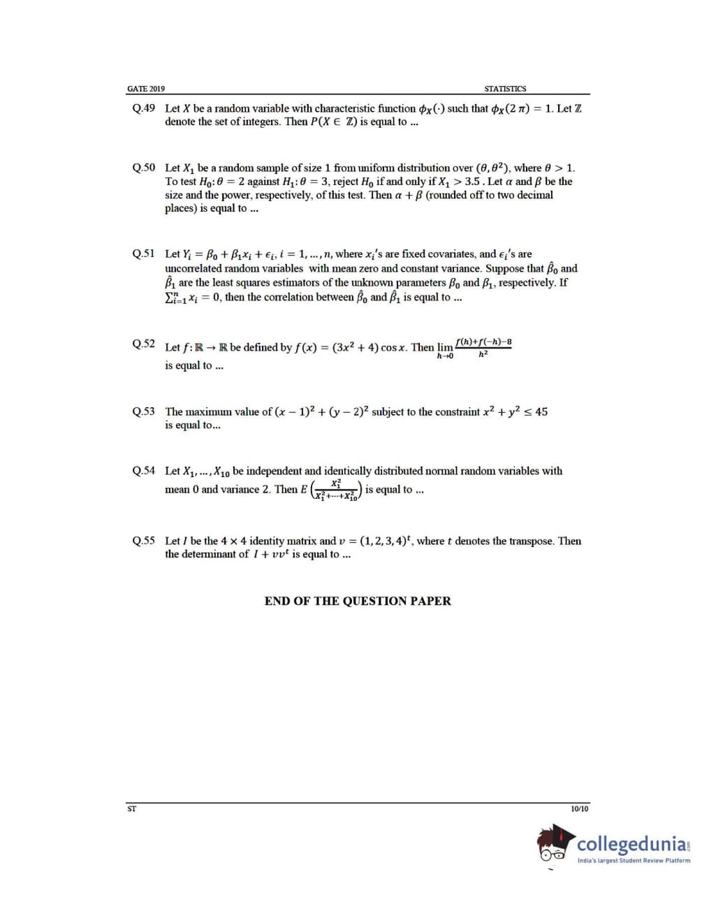 GATE 2019 ST (Statistics) Question Paper with Answer Key PDF conducted on February 03, 2019 in the Afternoon Session is available for download. The examination was conducted by IIT Madras. GATE 2019 ST had a moderate level of difficulty. GATE 2019 ST Question Paper included 22 NATs and 43 MCQs with a total weightage of 100 marks.