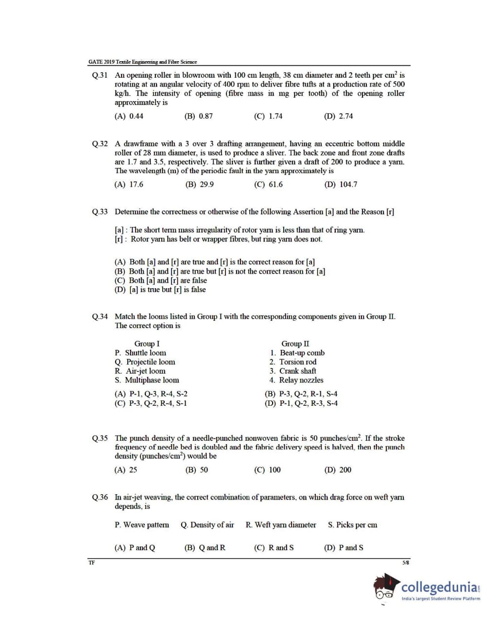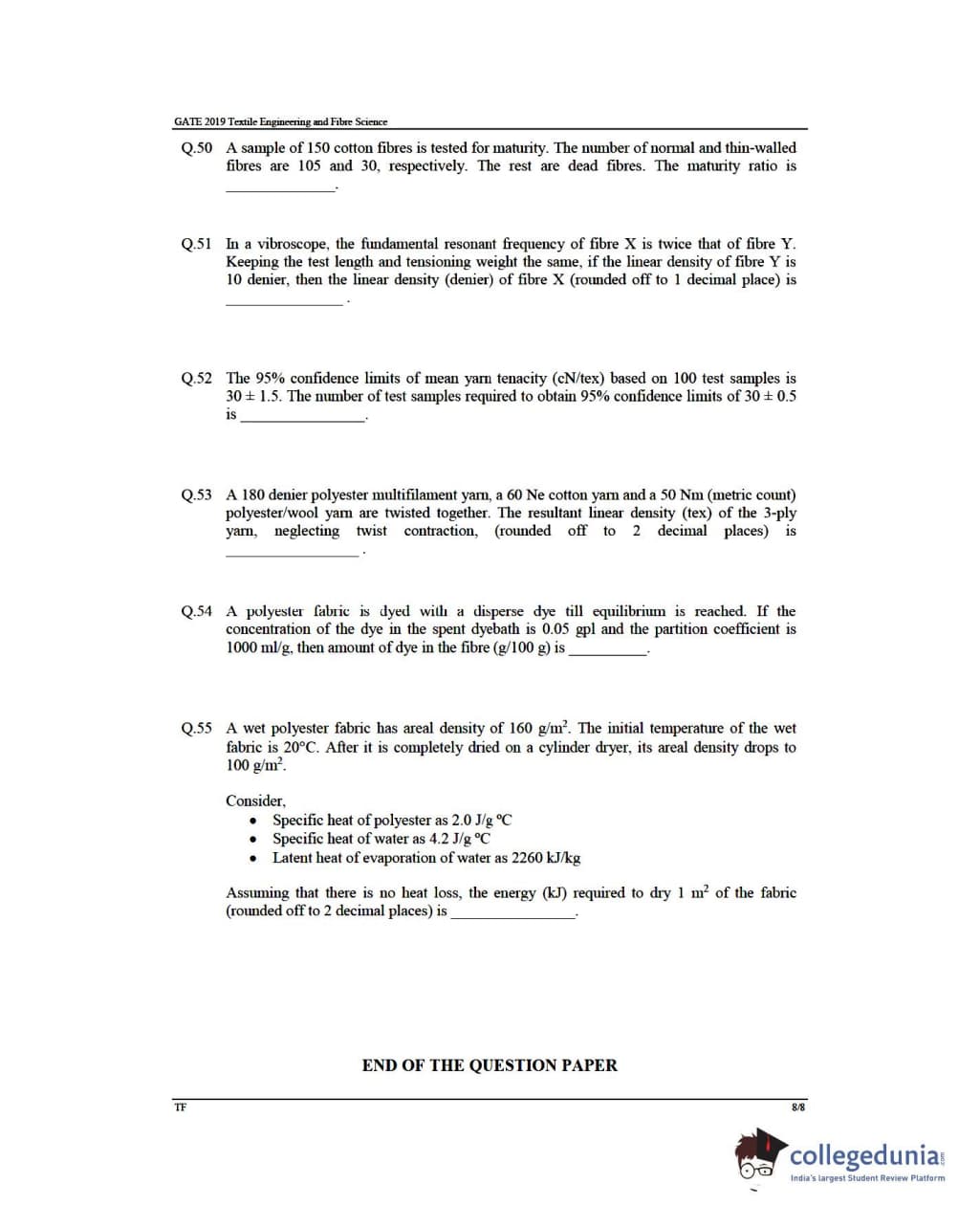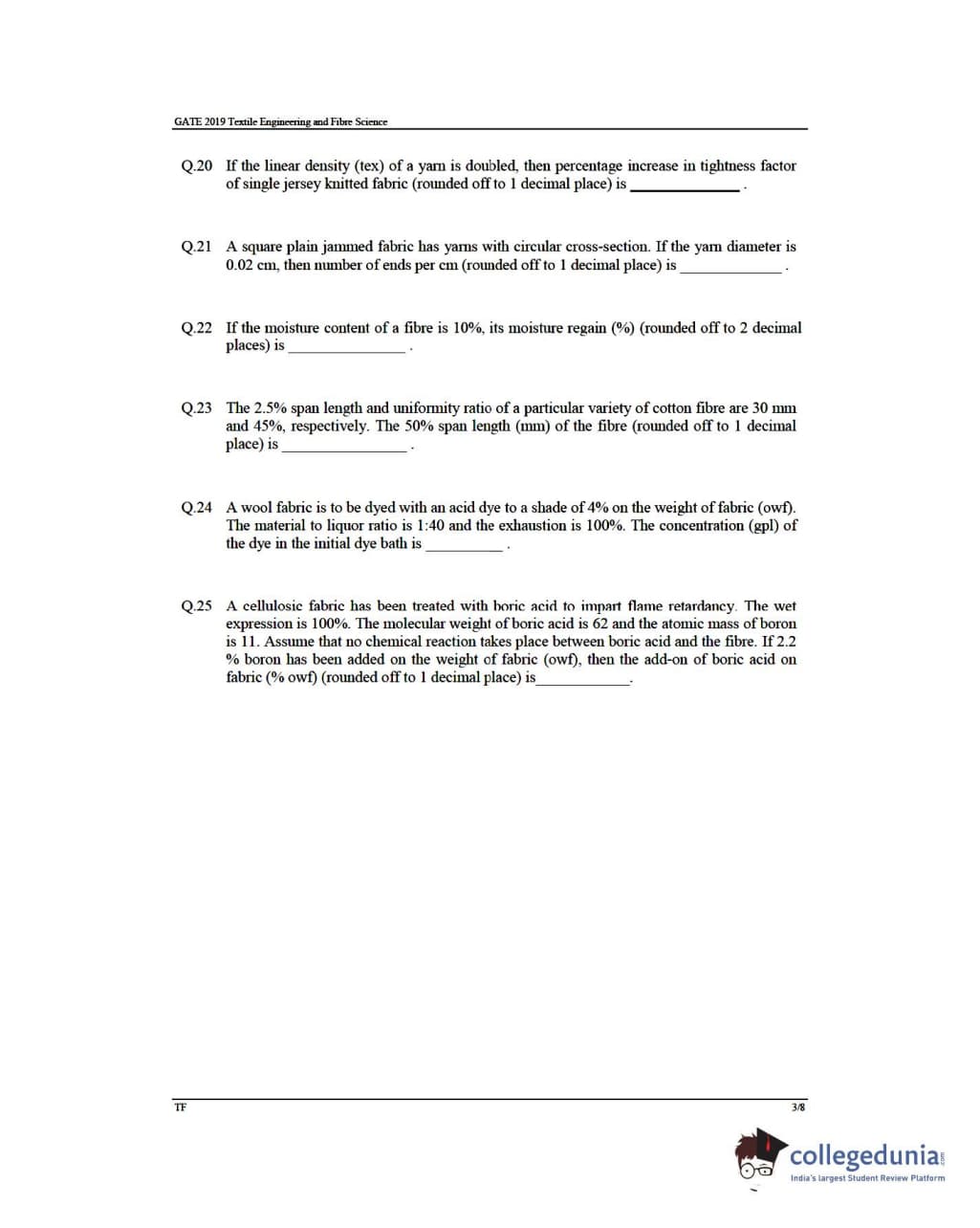 GATE 2019 TF (Textile Engineering and Fibre Science) Question Papers with Answer Key PDFs- February 02, 2019 (Afternoon Session)