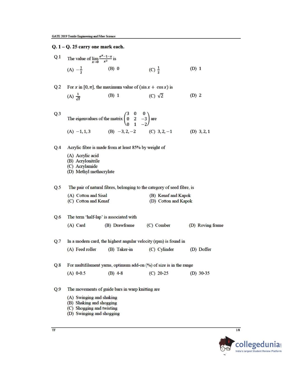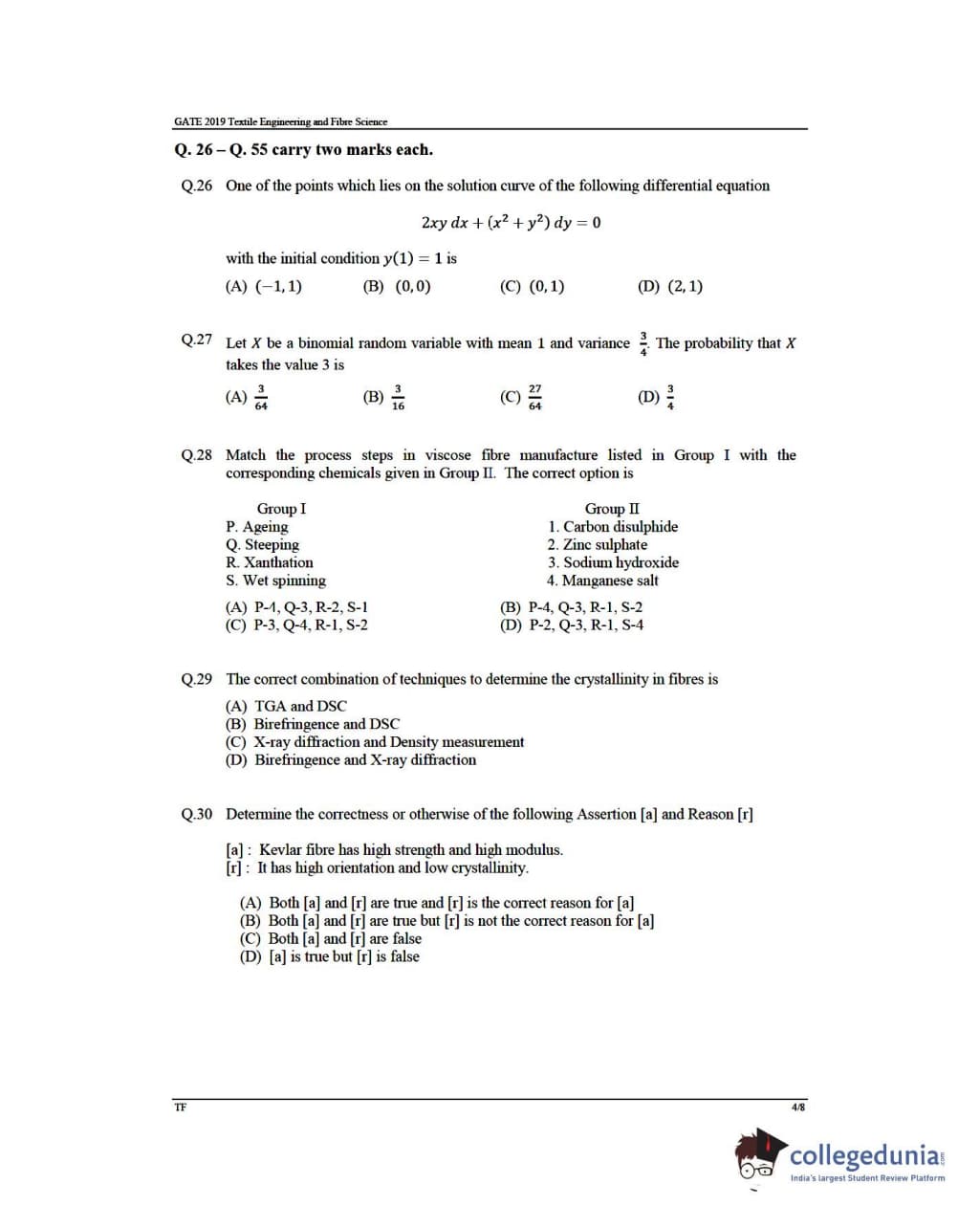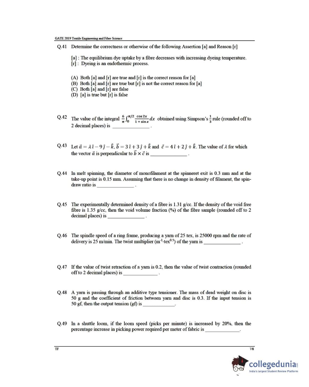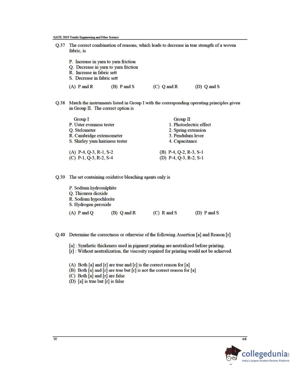 GATE 2019 TF (Textile Engineering and Fibre Science) Question Papers with Answer Key PDFs- February 02, 2019 (Afternoon Session)