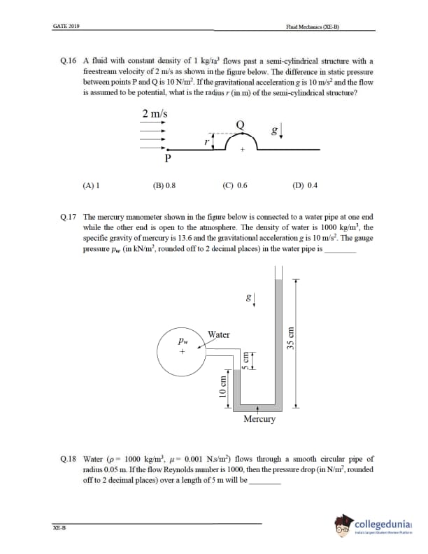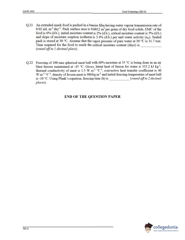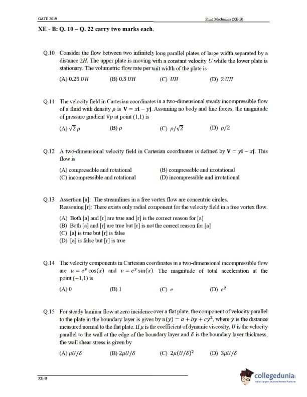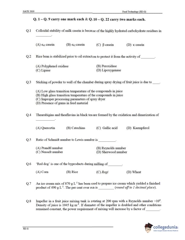 - Section B through G of the GATE XE 2019 has questions related to fluid mechanics, Material Science, Solid Mechanics, Food Technology, etc. There were 22 questions in this section, a total of 35 marks. Questions 1 to 9 carry one mark, and the questions from 10 to 22 carry two marks. For every Wrong answer, marks were deducted from the total marks.