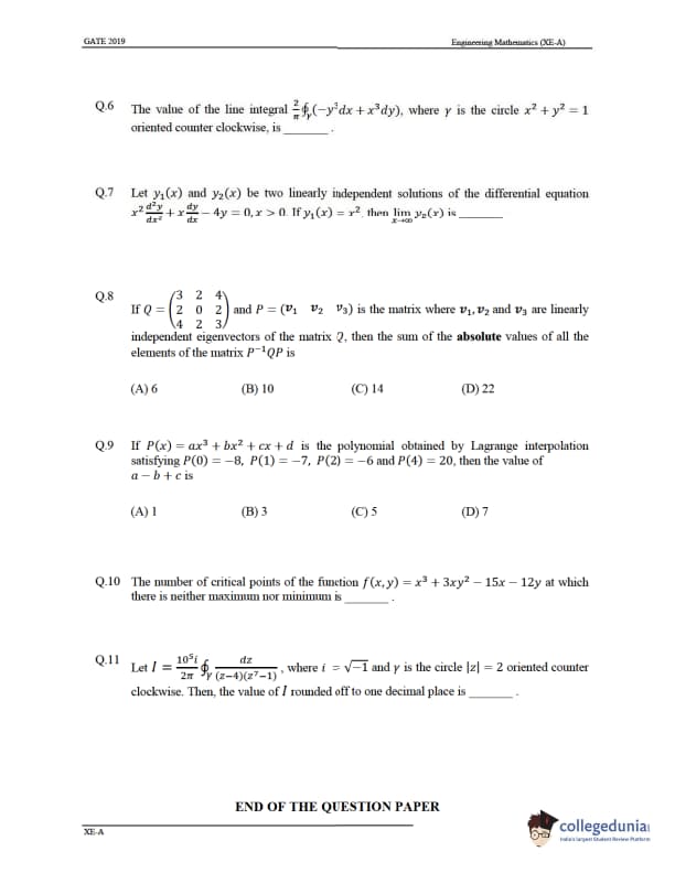 - In GATE XE 2019 paper, Section A is for Engineering Mathematics which was compulsory to attempt. Section A has 11 Questions from which Questions number 1 to 7 carry one mark each and Questions number 8 to 11 carry two marks each.