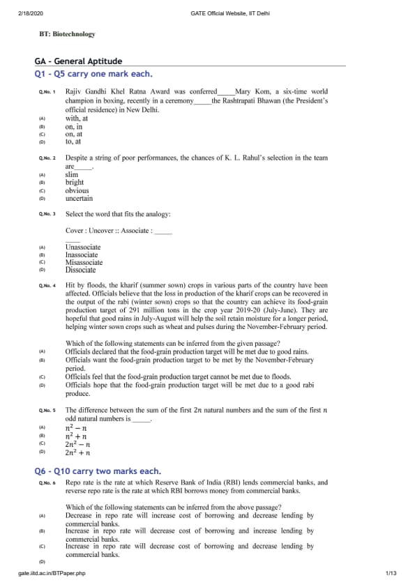 - GATE 2020 BT question paper had 65 questions for 100 marks.