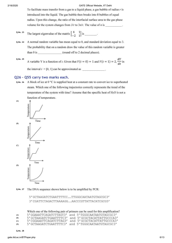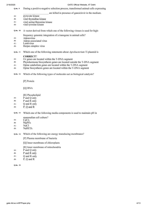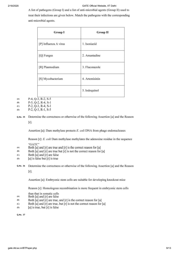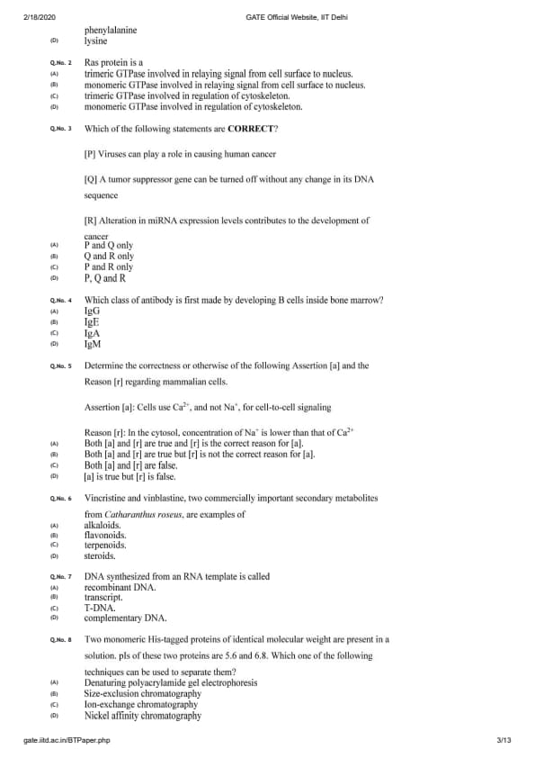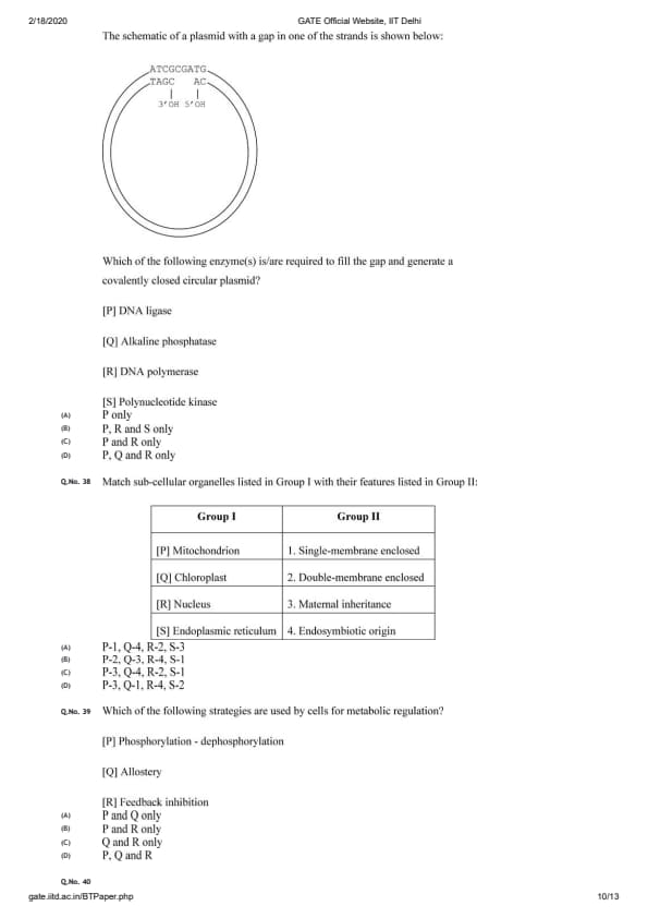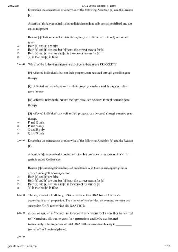 GATE 2020 BT Question Paper with Answer Key PDFs February 2 - Forenoon Session