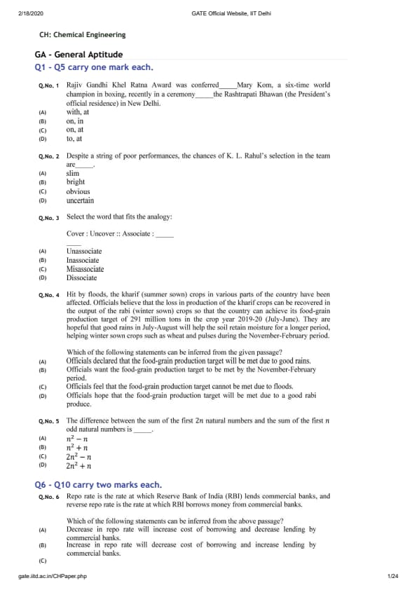 - There were two kinds of questions listed in GATE 2020 CH i.e MCQs (Multiple Choice Questions) and NATs (Numerical Answer Type)