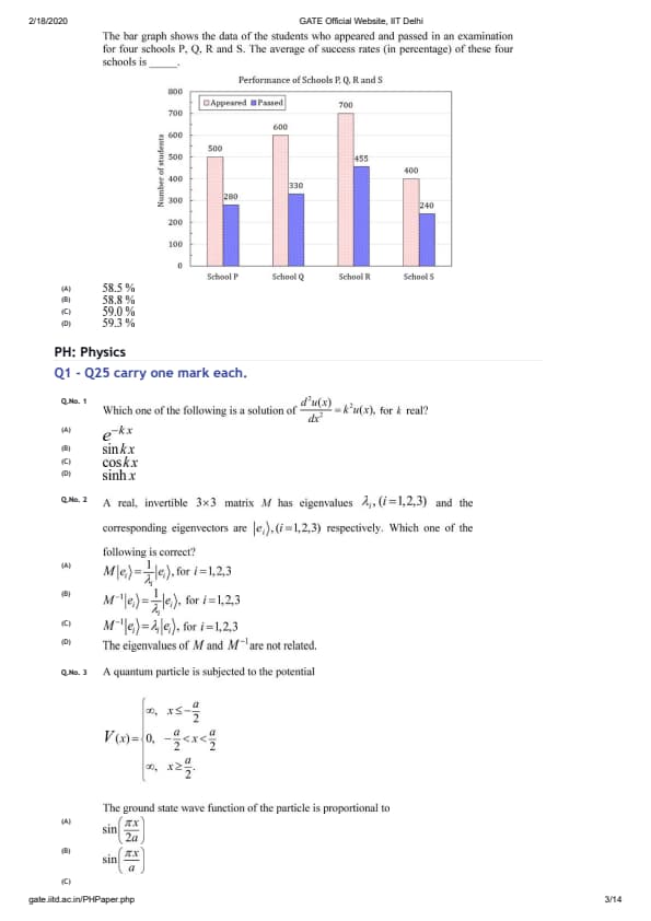 GATE 2020 PH exam was held on February 1, 2020 in the forenoon slot. The exam was conducted in online mode - computer based test. Students can download GATE 2020 PH Question Paper with Answer Key PDFs. The difficulty level of GATE 2020 PH paper was between moderate and easy. Highest number of questions were asked from Mathematical Physics and Quantum Mechanics while there was no question from Atomic and Molecular Physics.
