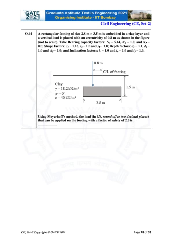 Using Meyerhoff’s method, the load (in kN, round off to two decimal places) that can be applied on the footing with a factor of safety of 2.5 is \_\_\_\_\_.