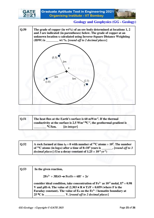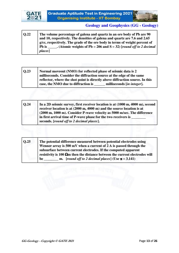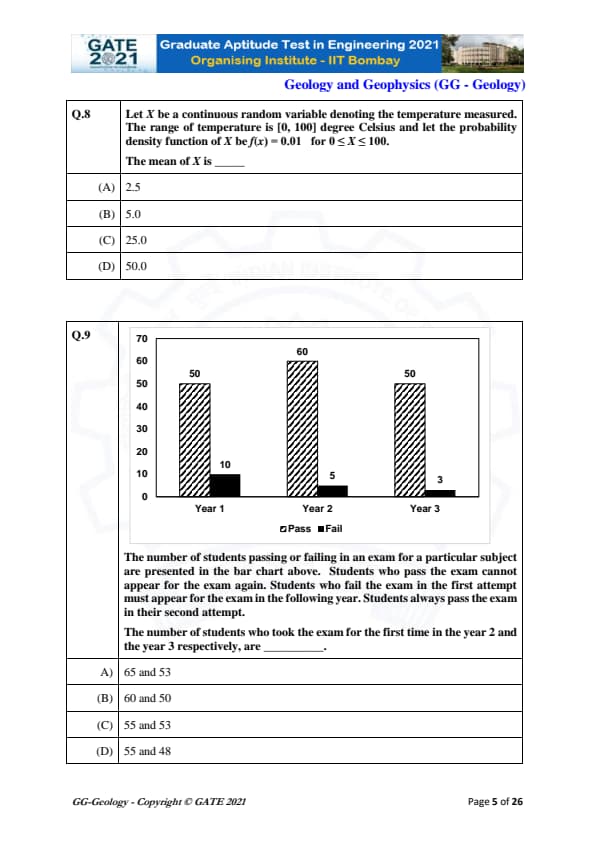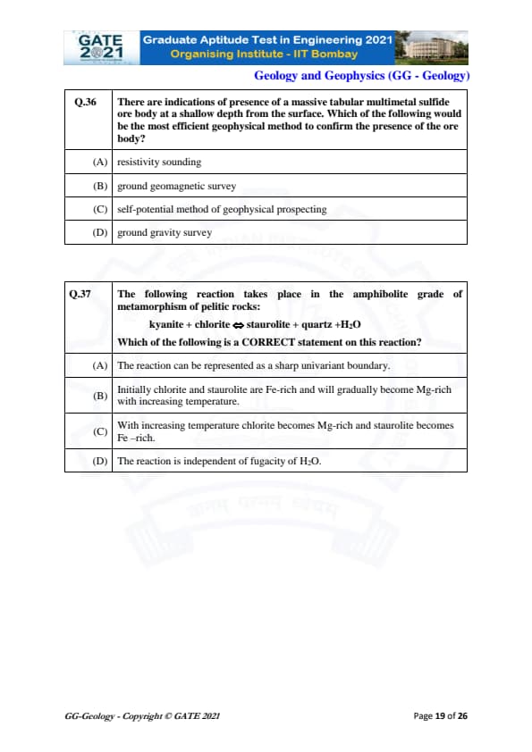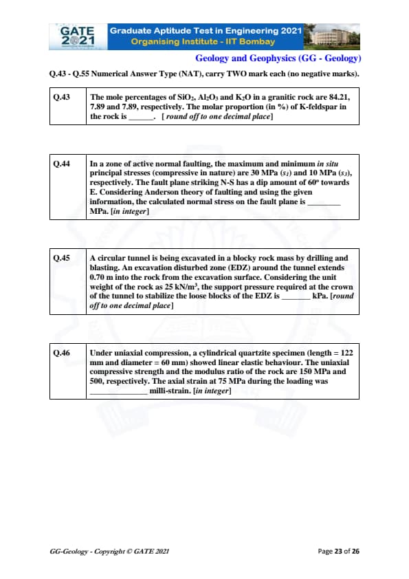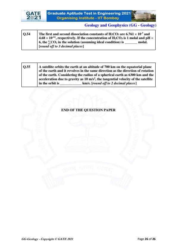 GATE 2021 GG Question Paper with Answer Key is available for download. GATE 2021 GG was conducted by IIT. Bombay on 7th February 2021 in the forenoon session (9:30 AM to 12:30 PM). A total of 65 questions were listed by IIT Bombay, out of which 10 questions were related to General Aptitude, while remaining 55 questions related to core GG that were accountable for 64% of the total weightage.The overall difficulty level of the exam was moderately difficult.