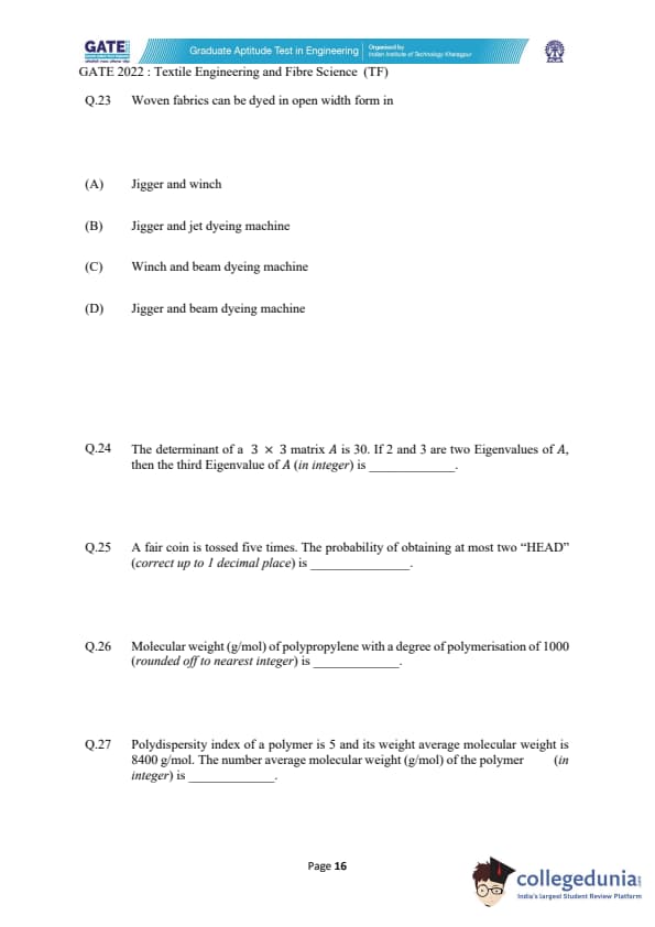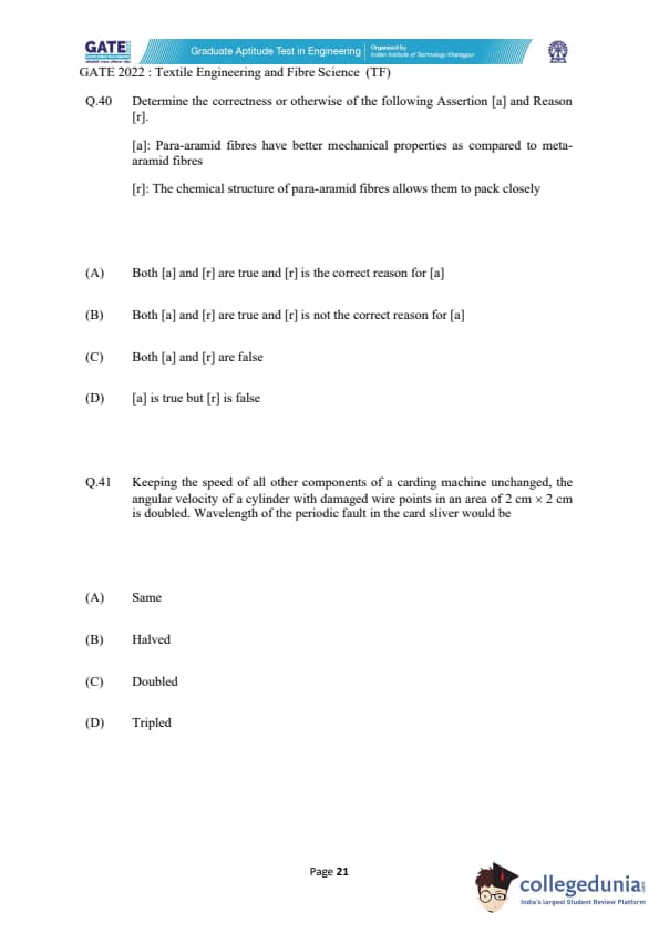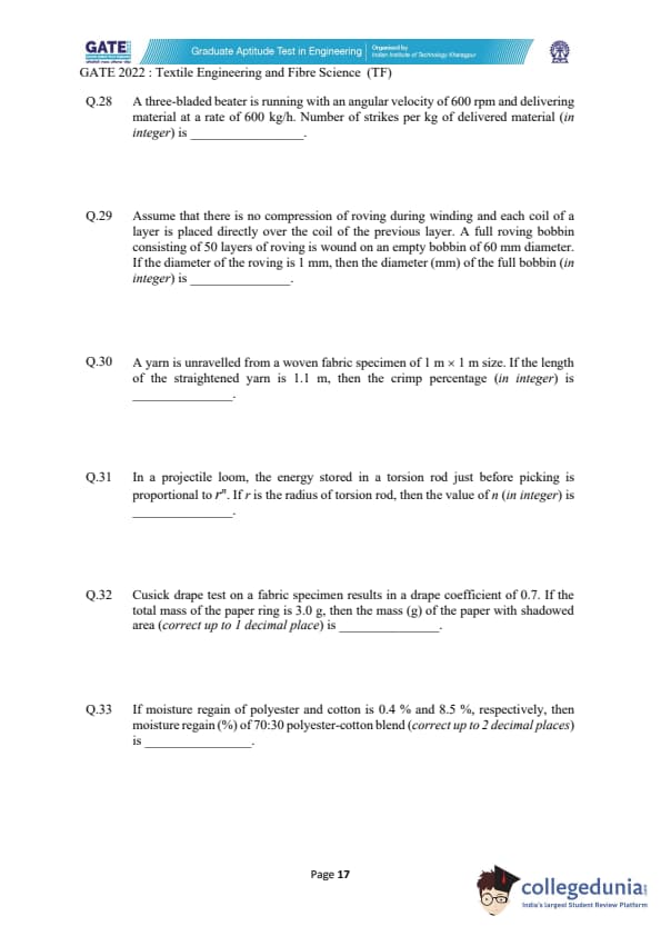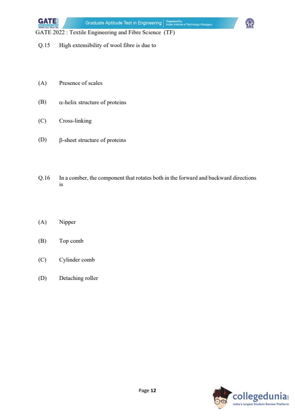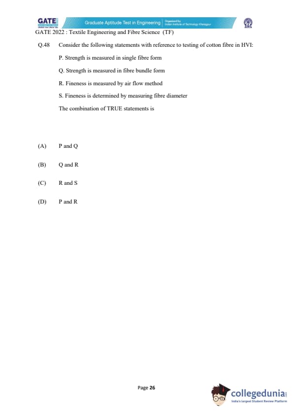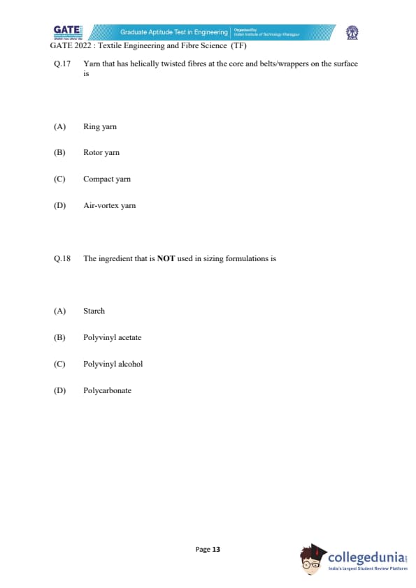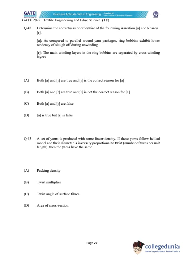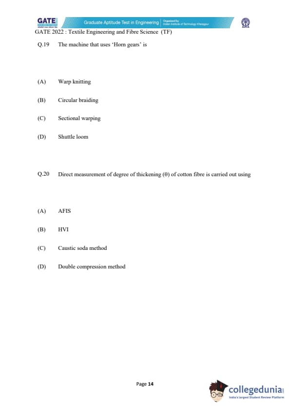 | GATE 2022 Textile Engineering and Fibre Science (TF) Question Paper | Check Solutions |