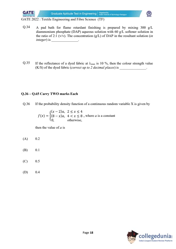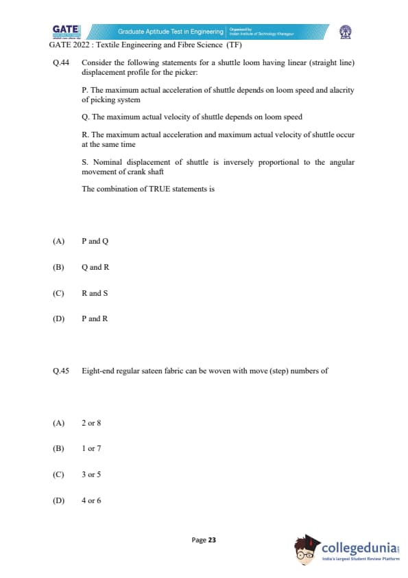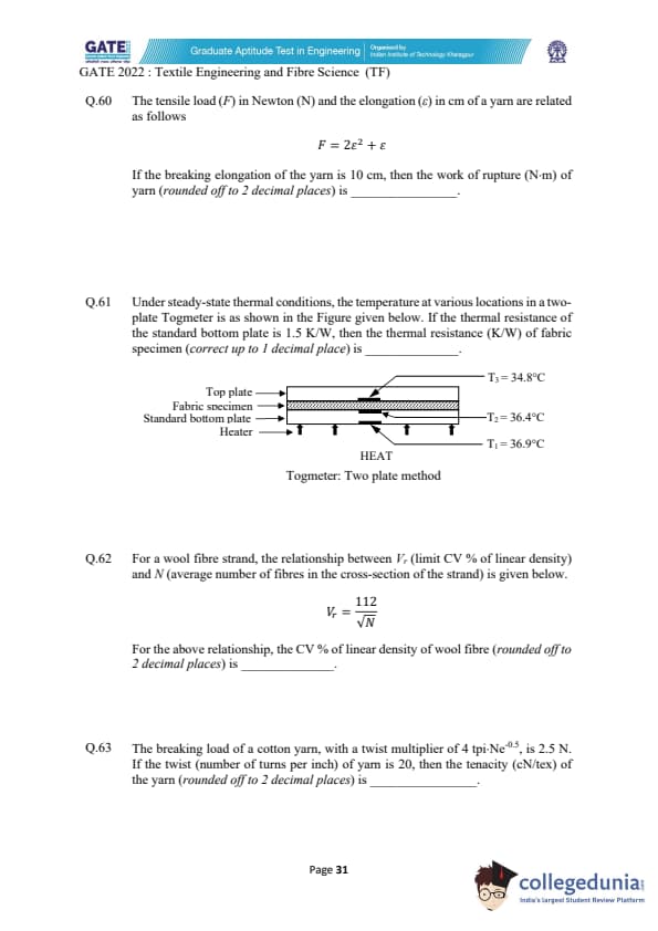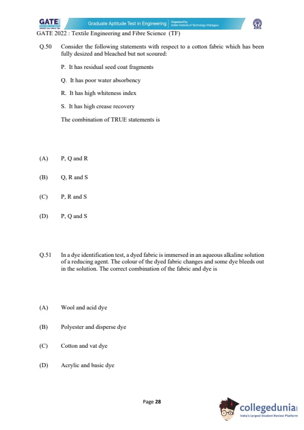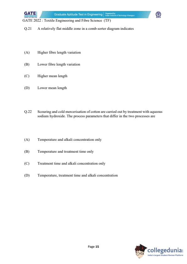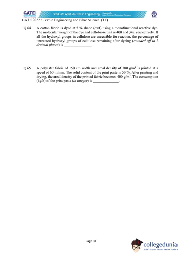 GATE 2022 Textile Engineering and Fibre Science (TF) Question Paper with Solutions PDFs are available to download. GATE 2022 TF was conducted on 6th February, 2022 in the Afternoon Session (2:30 PM to 5:30 PM). This year, IIT took the charge to organize GATE examinations. The overall exam difficulty level was rated moderate to tough. The exam comprises two sections i.e General Aptitude section and Textile based questions. The General Aptitude section was rated easy to moderate, while the textiles based questions were rated difficult.