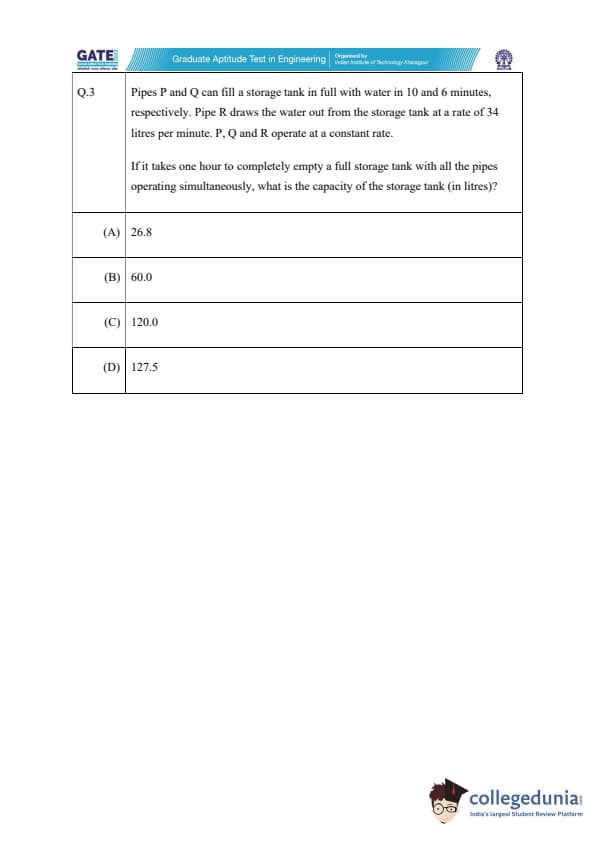 Pipes P and Q can fill a storage tank in full with water in 10 and 6 minutes, respectively. Pipe R draws the water out from the storage tank at a rate of 34 litres per minute. P, Q and R operate at a constant rate.