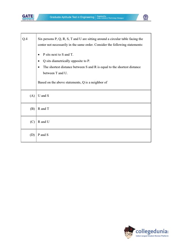 Six persons P, Q, R, S, T, and U are sitting around a circular table facing the center not necessarily in the same order. Consider the following statements: