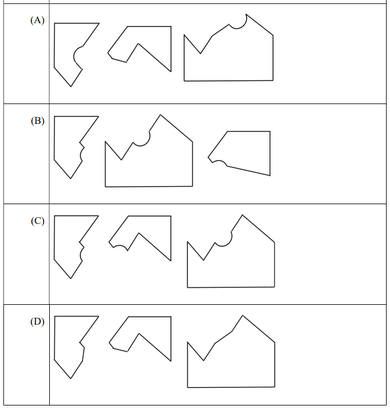 Which one of the following sets of pieces can be assembled to form a square with a single round hole near the center? Pieces cannot overlap.
