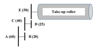 A take-up motion is shown below. The number of teeth on gear A, B, C, D and E are 60, 20, 40, 25 and 50, respectively. The circumference of the take-up roller is 40 cm. If one tooth is broken on gear B, then the wavelength (cm) of the fault in fabric (in integer) is _______.