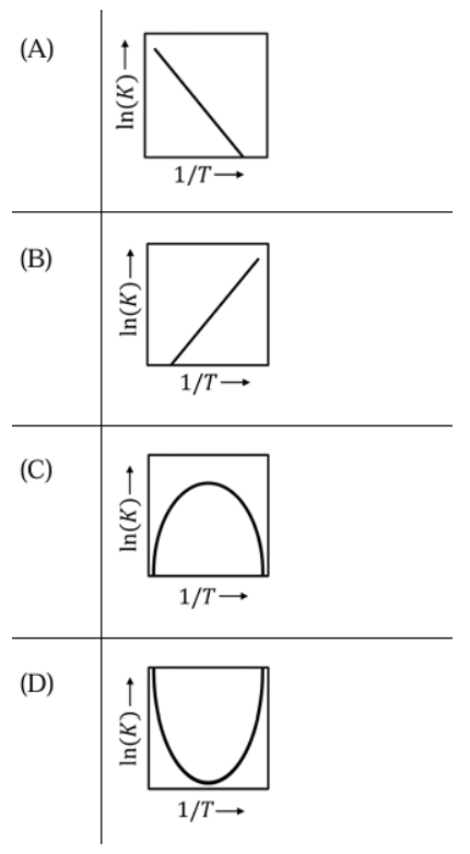 For a reversible endothermic chemical reaction with constant heat of reaction over the operating temperature range, \(K\) is the thermodynamic equilibrium constant. Which one of the following figures shows the CORRECT dependence of \(K\) on temperature \(T\)?