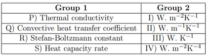 \[ \boxed{(A) \; P-II, \; Q-I, \; R-IV, \; S-III} \] Quick Tip: - Always recall standard heat transfer units: • \(k\) (thermal conductivity) → W·m\(^{-1}\)K\(^{-1}\)
