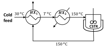 An isothermal jacketed continuous stirred tank reactor (CSTR) operating at \(150^{\circ}\mathrm{C}\) is shown. The cold feed at \(30^{\circ}\mathrm{C}\) is first preheated to \(T\) (\(T<150^{\circ}\mathrm{C}\)) in heat exchanger \(HX_1\) (using process-to-process heat recovery) and then heated to \(150^{\circ}\mathrm{C}\) in a utility heater \(HX_2\). Mass flow rate and heat capacity are the same for all process streams and the overall heat transfer coefficient is independent of temperature. Which action will increase the value of \(T\)?