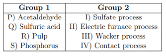 \[ \boxed{Correct Answer: (A)} \] Quick Tip: Wacker process \(\Rightarrow\) Acetaldehyde. Contact process \(\Rightarrow\) Sulfuric acid. Sulfate (Kraft) process \(\Rightarrow\) Pulp. Electric furnace \(\Rightarrow\) Phosphorus.