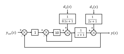 A cascade control strategy is shown in the figure. The transfer function between the output \((y)\) and the secondary disturbance \((d_2)\) is defined as \(G_{d2}(s)=\dfrac{y(s)}{d_2(s)}\).