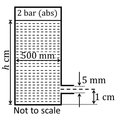 A cylindrical tank with a diameter of \(500\ mm\) contains water (density \(=1\ g \cdot cm^{-3}\)) up to a height \(h\). A \(5\ mm\) diameter round nozzle, whose center is \(1\ cm\) above the base of the tank, has its exit open to the atmosphere. The pressure above the water level in the tank is maintained at \(2\ bar (abs)\). Neglect all frictional and entry/exit losses. Take \(g=10\ m\,s^{-2}\) and atmospheric pressure \(=1\ bar\). The absolute value of initial \(\dfrac{dh}{dt}\) (in \(mm\,s^{-1}\)) when \(h=51\ cm\) is ______ (rounded off to two decimal places).