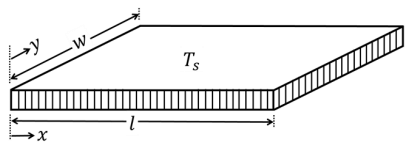 A fluid is flowing steadily under laminar conditions over a thin rectangular plate at temperature \(T_s\) as shown. The free-stream velocity and temperature are \(u_\infty\) and \(T_\infty\), respectively. When the fluid flow is only in the \(x\)-direction, \(h_x\) is the local heat transfer coefficient. Similarly, when the fluid flow is only in the \(y\)-direction, \(h_y\) is the corresponding local heat transfer coefficient. Use the correlation \(\mathrm{Nu}=0.332\,\mathrm{Re}^{1/2}\,\mathrm{Pr}^{1/3}\) for the local heat transfer coefficient, where Nu, Re and Pr are the appropriate Nusselt, Reynolds and Prandtl numbers. The average heat transfer coefficients are defined as \(\displaystyle \overline{h}_l=\frac{1}{l}\int_0^l h_x\,dx\) and \(\displaystyle \overline{h}_w=\frac{1}{w}\int_0^w h_y\,dy\). If \(w=1\ m\) and \(l=4\ m\), the value of the ratio \(\overline{h}_w/\overline{h}_l\) is ______ (in integer).