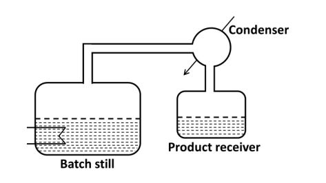 Distillation of a non-reactive binary mixture with components \(A\) and \(B\) is carried out in a batch still as shown. The initial charge in the still is \(1\ kmol\). The initial and final amounts of \(A\) in the still are \(0.1\ kmol\) and \(0.01\ kmol\), respectively. The relative volatility is constant at \(\alpha = 4.5\). The mole fraction of \(B\) remaining in the vessel is _____ (rounded off to three decimal places).