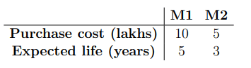 A design engineer needs to purchase a membrane module (M) for a plant. Two options are available: M1 and M2. The overall plant life is 7 years. Interest rate is \(8%\) per annum, compounded annually. The table gives purchase cost (lakhs of rupees) and expected life (years):