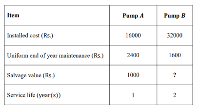 Step 3: Annual cost: \[ A=C_0\times CRF=58\times 0.1971=11.42\ lakhs\approx \boxed{11.4}. \] Quick Tip: Annualizing a capital cost uses \(A=C_0 \times CRF\) with \(CRF=\dfrac{i(1+i)^n}{(1+i)^n-1}\). Installation factor converts purchase price to total installed cost before annualization.
