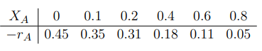 Step 2: At the desired conversion \(X_A=0.8\), the exit rate from the table is \((-r_A)=0.05\ mol\,m^{-3}\,s^{-1}\).