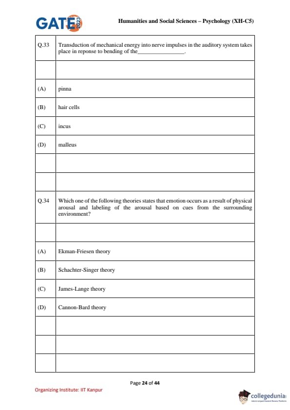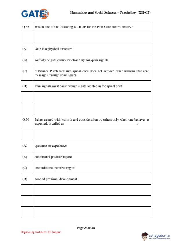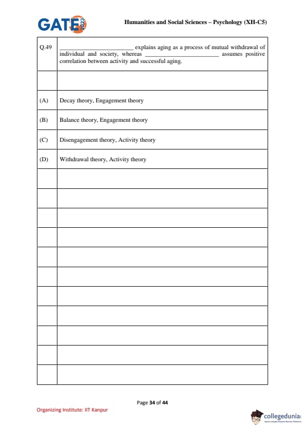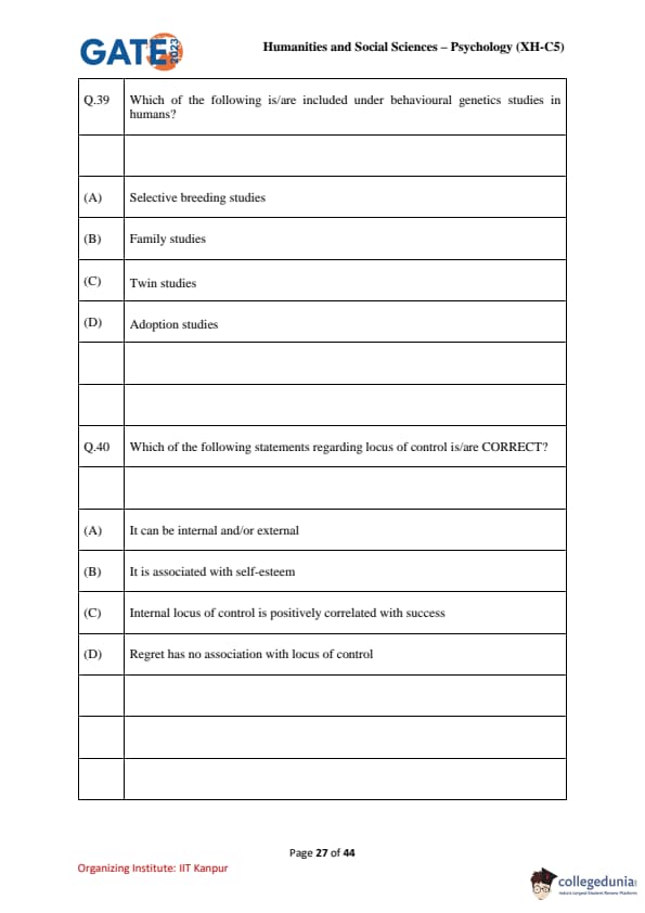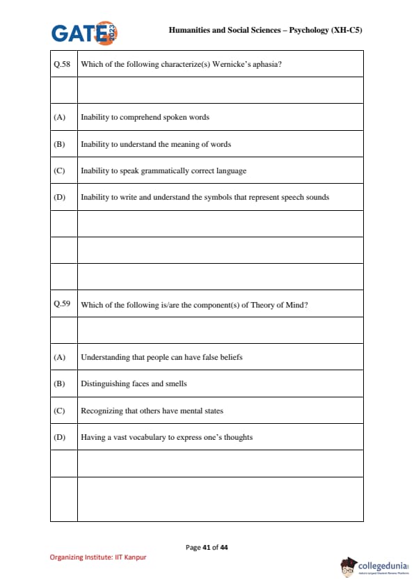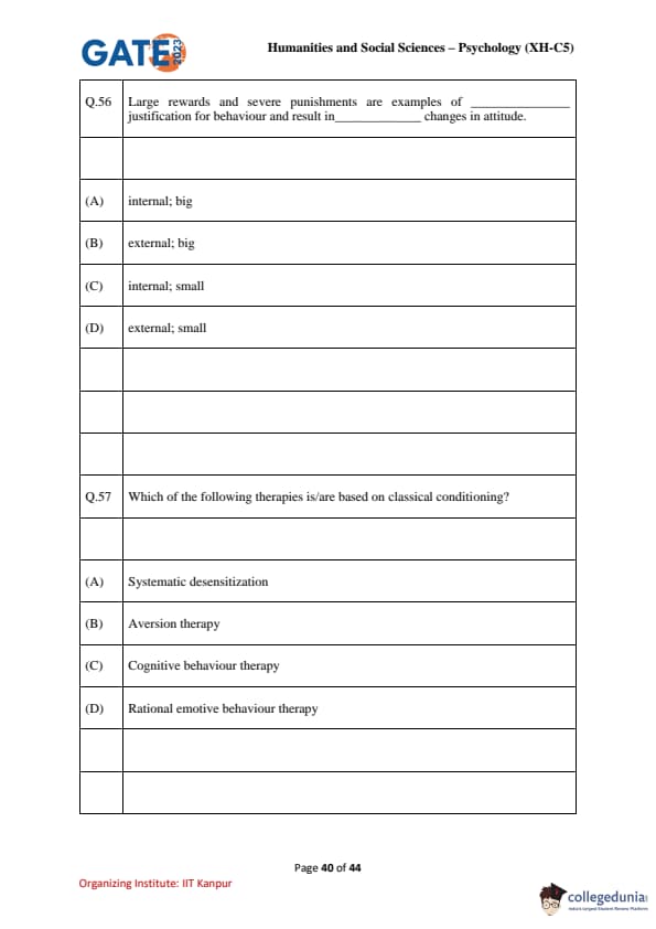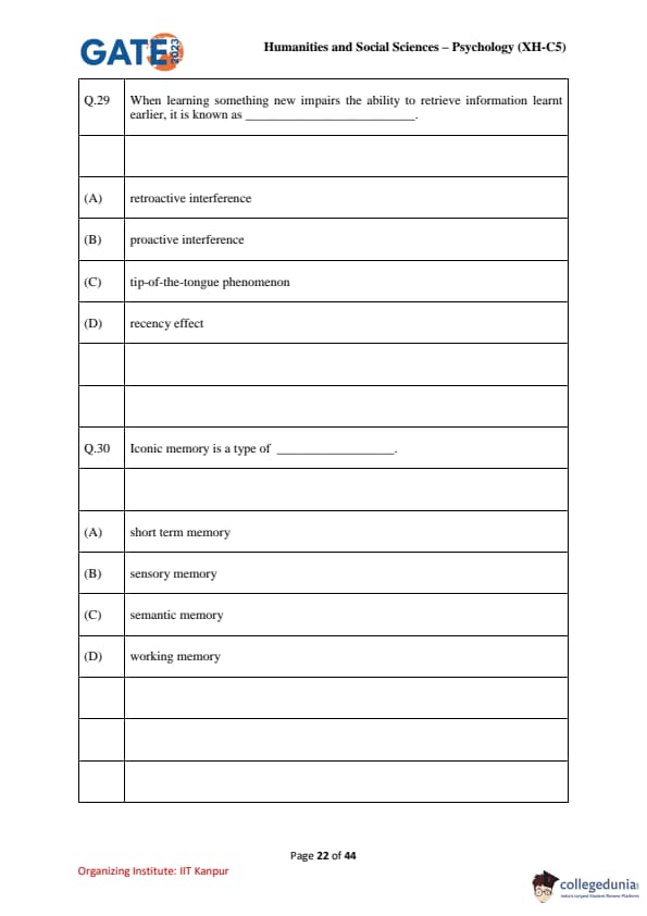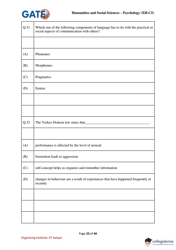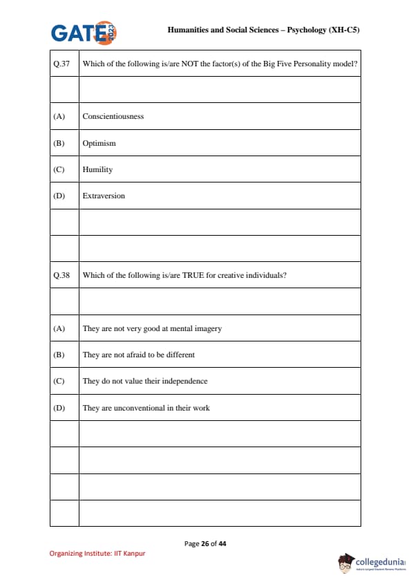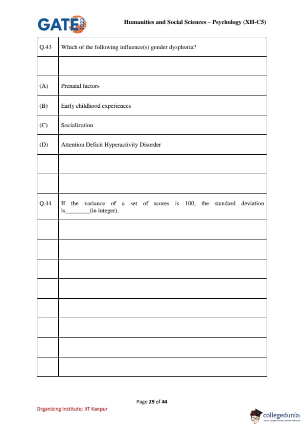 | GATE 2023 Humanities & Social Sciences Psychology Question Paper with Solutions | Check Solutions |