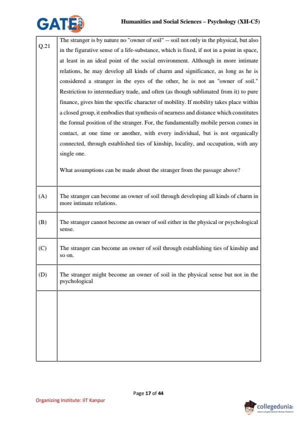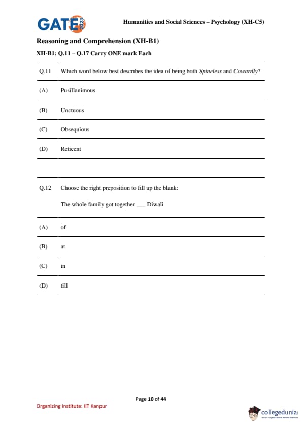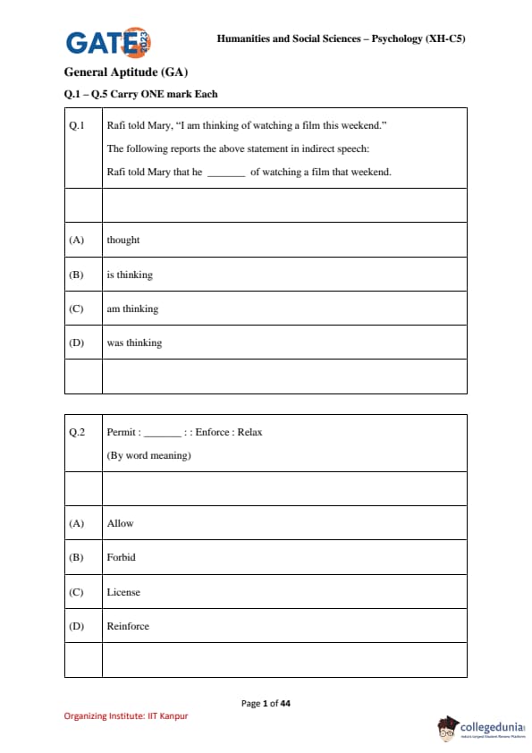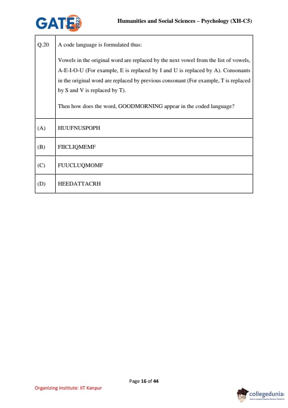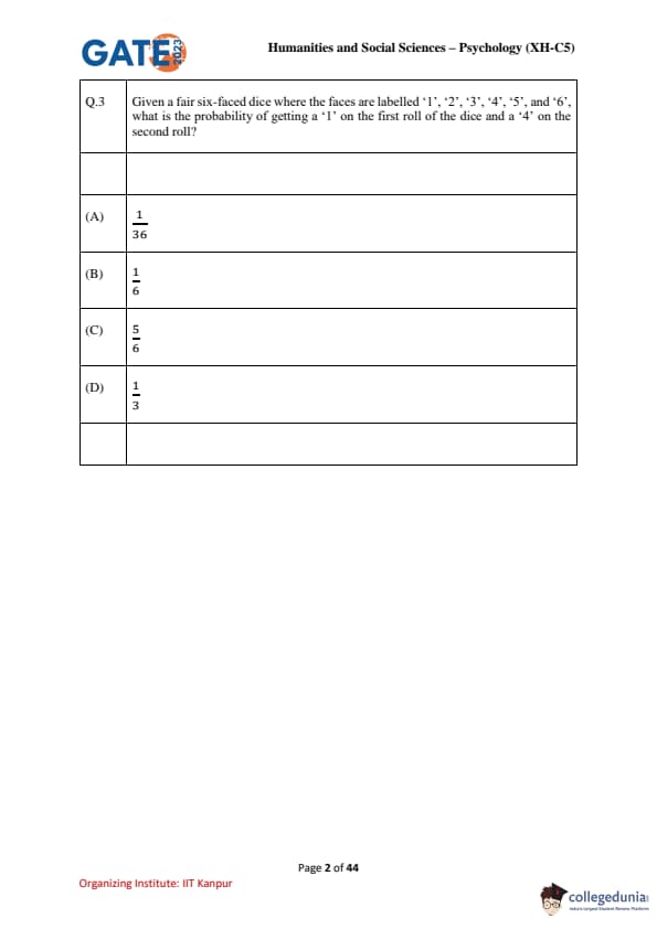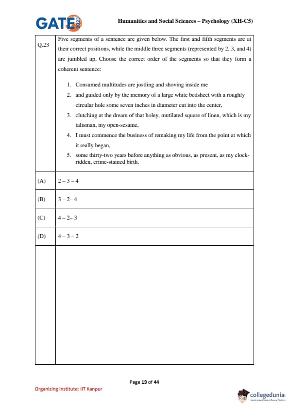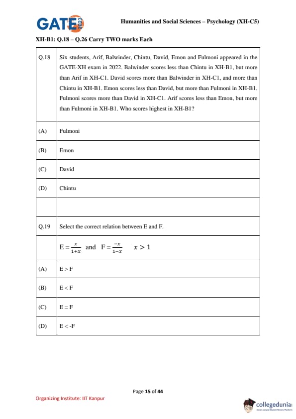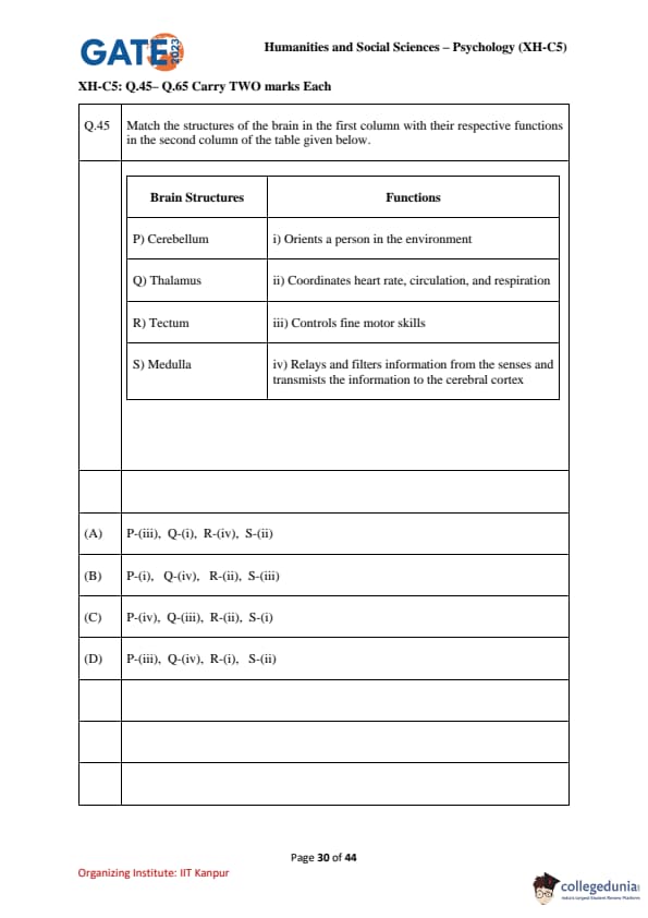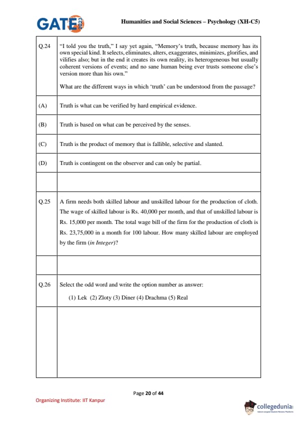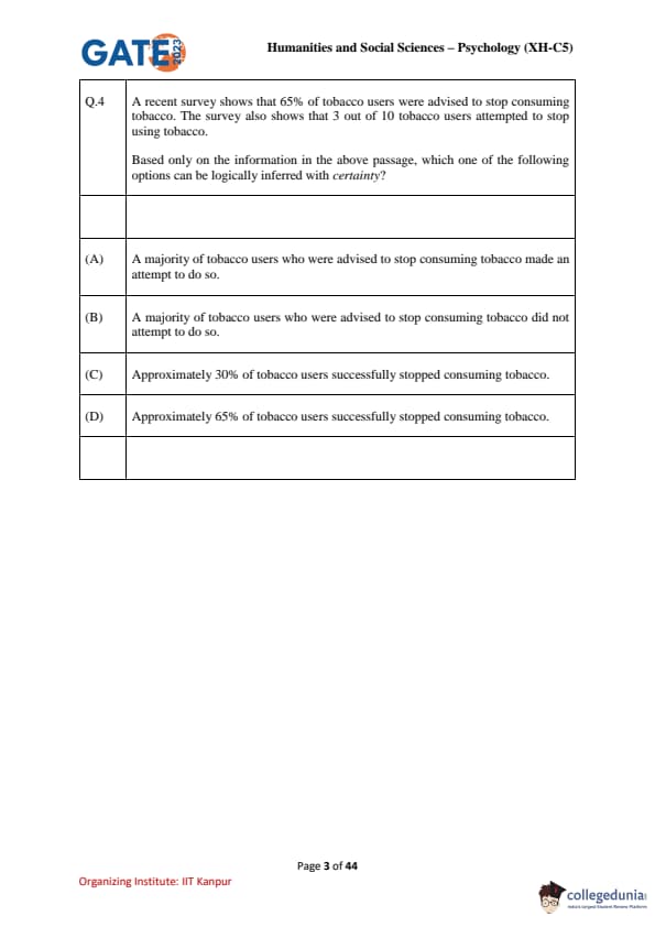 | GATE 2023 Humanities & Social Sciences Psychology Question Paper with Solutions | Check Solutions |