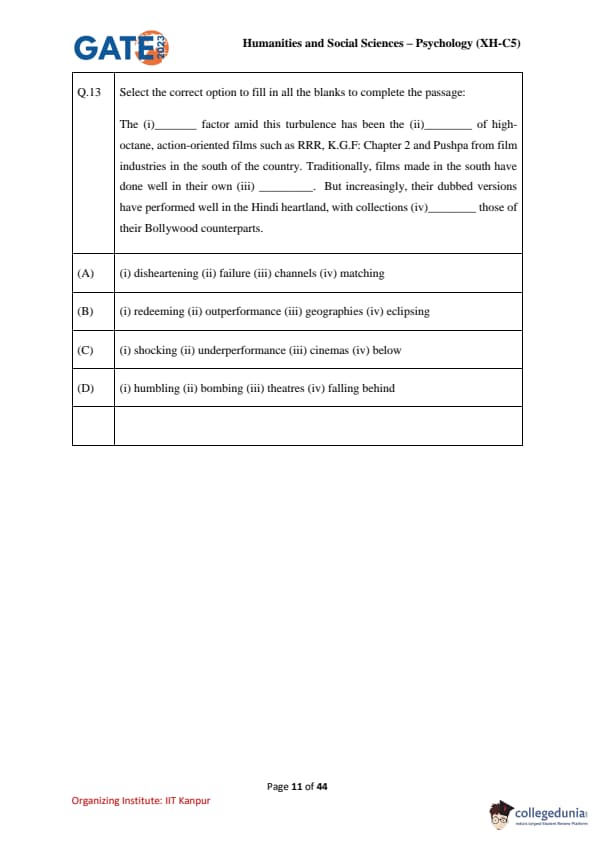 GATE 2023 Humanities & Social Sciences Psychology Question Paper PDF is available here for download. IIT Kanpur conducted GATE 2023 Humanities & Social Sciences exam on February 5, 2023 in the Forenoon Session from 09:30 AM to 12:30 PM. Students have to answer 65 questions in GATE 2023 Humanities & Social Sciences Psychology Question Paper carrying a total weightage of 100 marks. 10 questions are from the General Aptitude section and 55 questions are from Core Discipline.