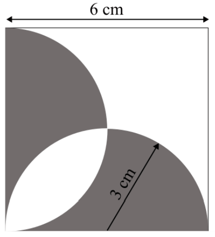 A square with sides of length \(6\,cm\) is given. The boundary of the shaded region is defined by two semi-circles whose diameters are the sides of the square, as shown. The area of the shaded region is ______ \(cm^2\).