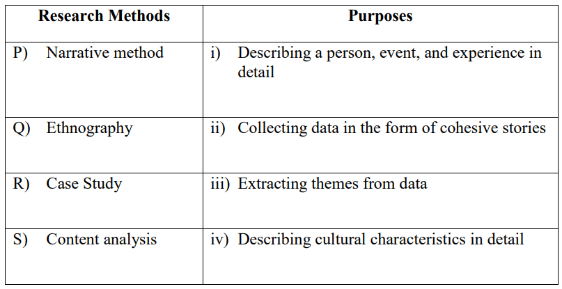Match the research methods in the first column with their purposes in the second column of the table given below.
