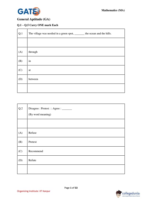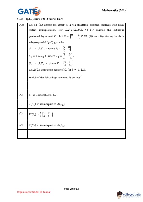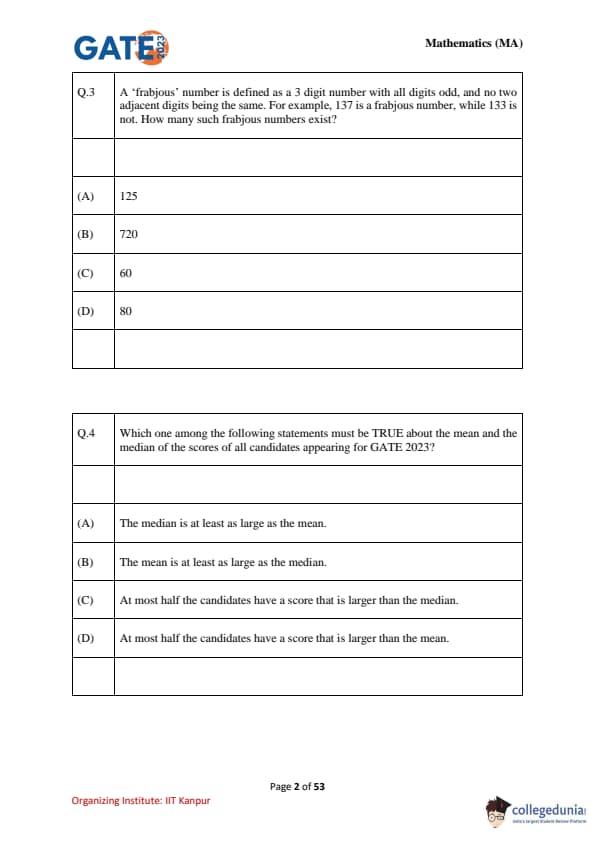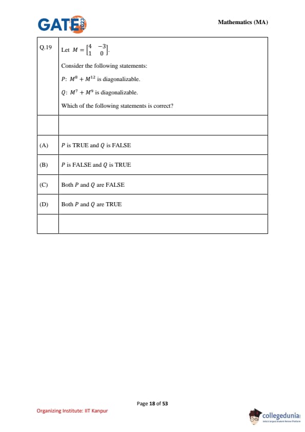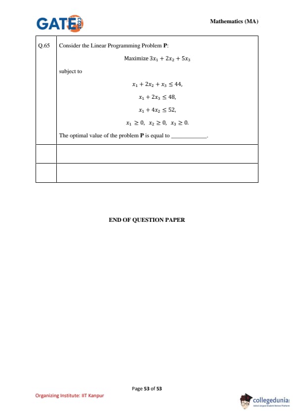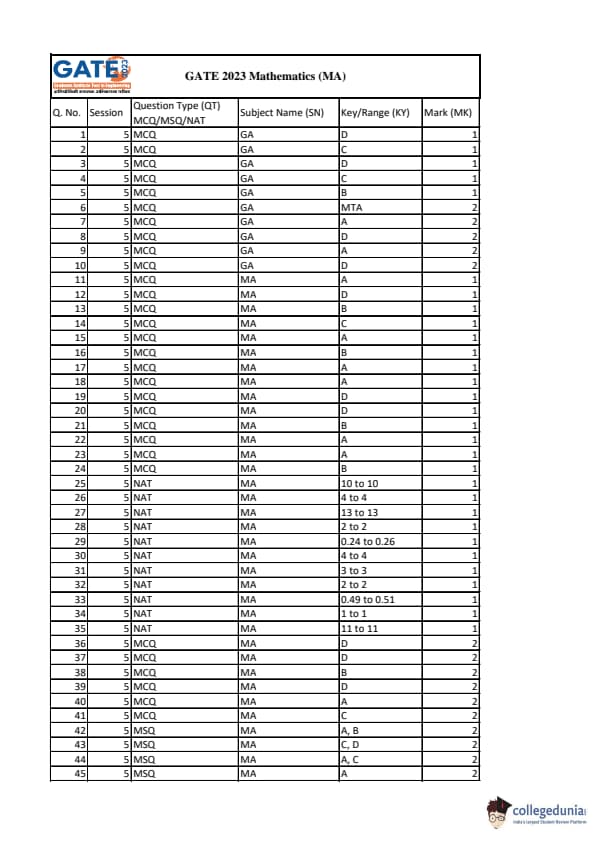 GATE 2023 Mathematics (MA) Question Paper PDF is available here for download. IIT Kanpur conducted GATE 2023 Mathematics exam on February 11, 2023 in the Forenoon Session from 09:30 AM to 12:30 PM. Students have to answer 65 questions in GATE 2023 Mathematics Question Paper carrying a total weightage of 100 marks. 10 questions are from the General Aptitude section and 55 questions are from Core Discipline.