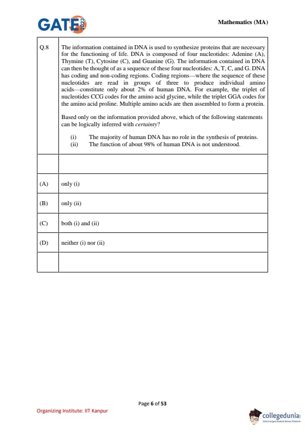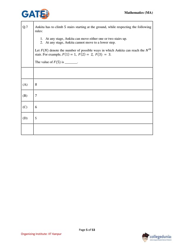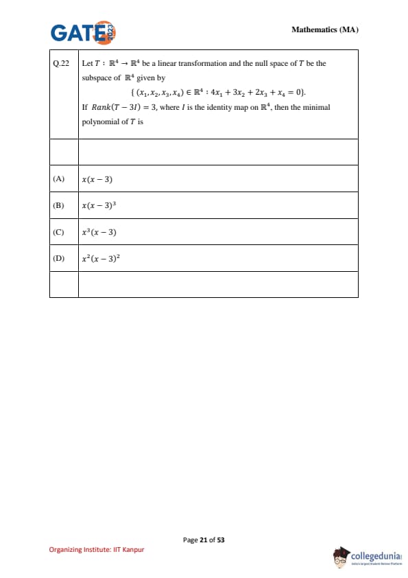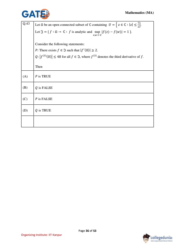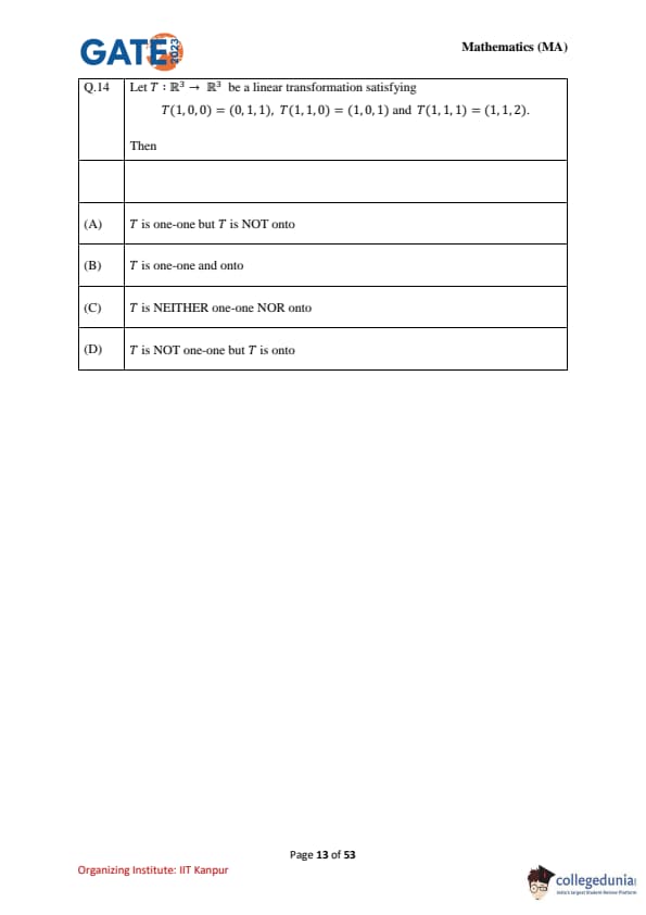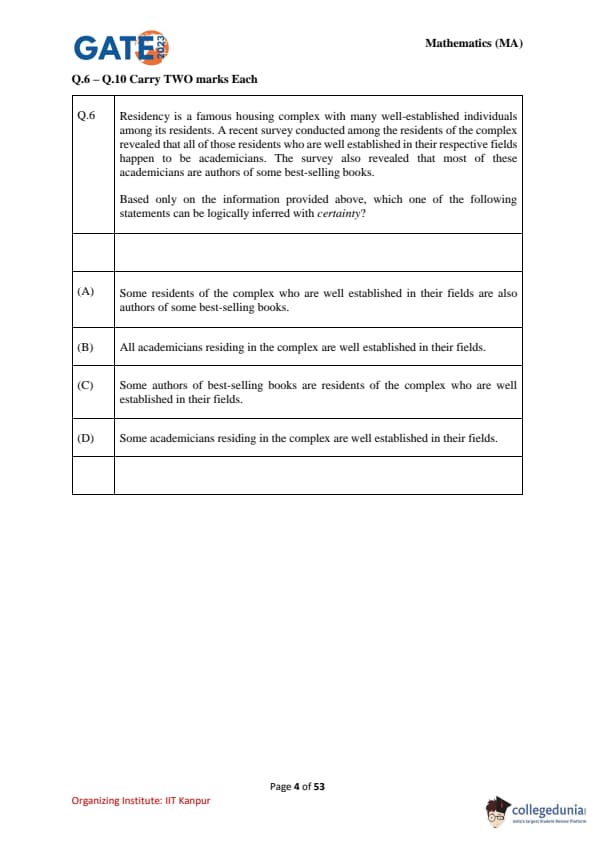 GATE 2023 Mathematics (MA) Question Paper PDF is available here for download. IIT Kanpur conducted GATE 2023 Mathematics exam on February 11, 2023 in the Forenoon Session from 09:30 AM to 12:30 PM. Students have to answer 65 questions in GATE 2023 Mathematics Question Paper carrying a total weightage of 100 marks. 10 questions are from the General Aptitude section and 55 questions are from Core Discipline.