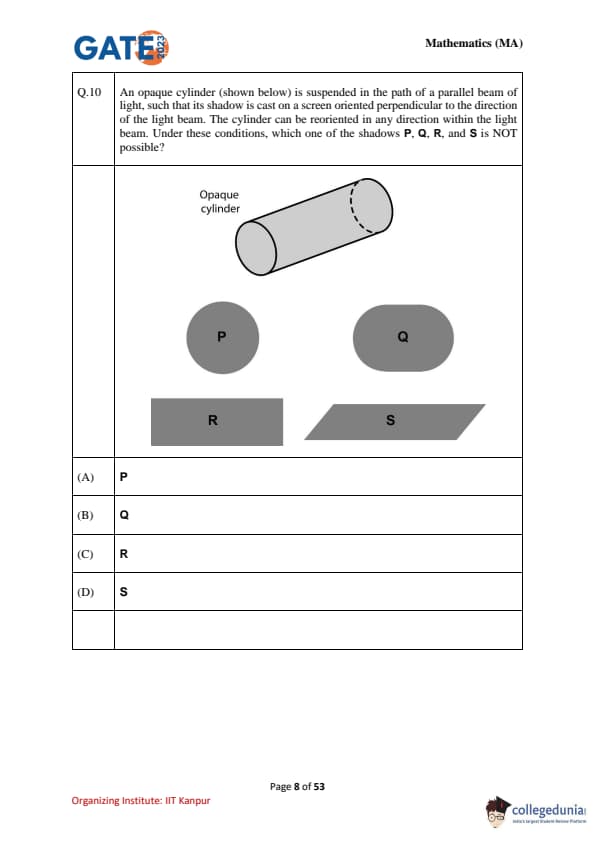 An opaque cylinder (shown below) is suspended in the path of a parallel beam of light, such that its shadow is cast on a screen oriented perpendicular to the direction of the light beam. The cylinder can be reoriented in any direction within the light beam. Under these conditions, which one of the shadows P, Q, R, and S is NOT possible?