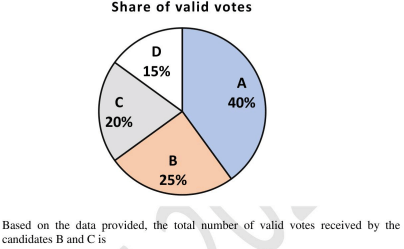 In an election, the share of valid votes received by the four candidates A, B, C, and D is represented by the pie chart shown. The total number of votes cast in the election were 1,15,000, out of which 5,000 were invalid.
