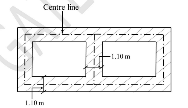 The following figure shows the excavation plan of a two-room structure, where the trench has a uniform width of \( 1.10 \, meters \). If the cumulative center line length of the trench is \( 41.10 \, meters \) and the required depth of concrete to be poured is \( 0.30 \, meters \), the \textit{volume of concrete in the foundation, in cubic meters, will be __________ (rounded off to two decimal places).