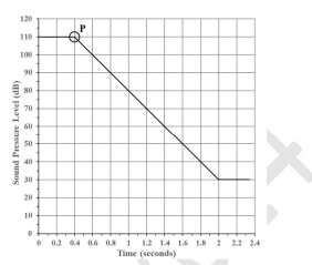 The decay of sound in an enclosed lecture hall of volume \( 3500 \, m^3 \) is shown in the figure below. The sound source is switched off at point \( P \). Using the Reverberation Time (\( RT_{60} \)) obtained from the figure, the calculated total sound absorption of the hall, in Sabins, is __________ (rounded off to the nearest integer).