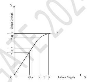 Labour supply and urban growth are represented in X and Y axes of the figure below. Curve OP represents the relationship between labour supply and urban growth. The ratios \( A:A' \) and \( B:B' \) are \( 1:1.2 \) and \( 3:1.2 \), respectively. If 6 units of labour is supplied in \( B \), then the number of units of urban growth in \( B' \) will be __________ (rounded off to one decimal place).