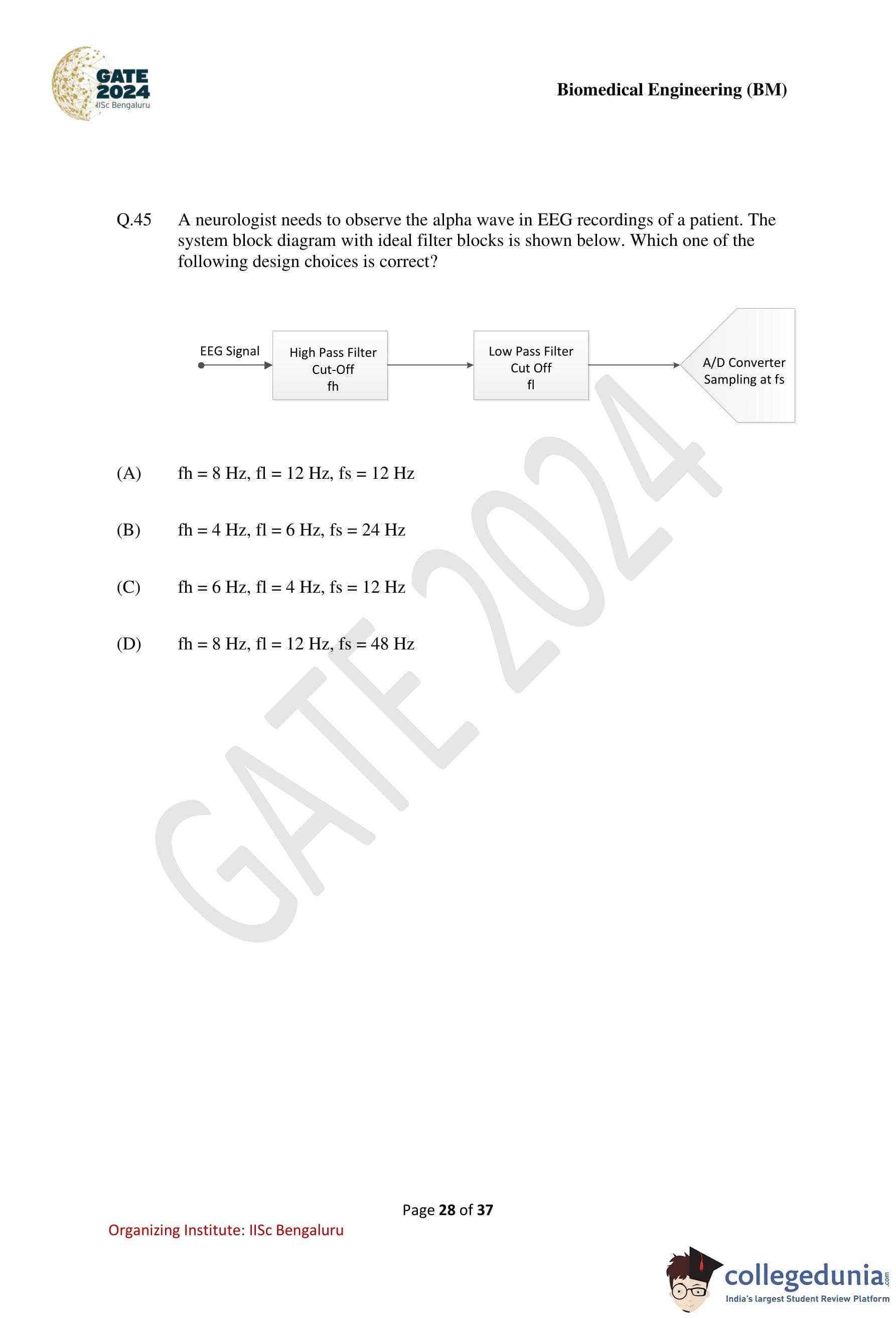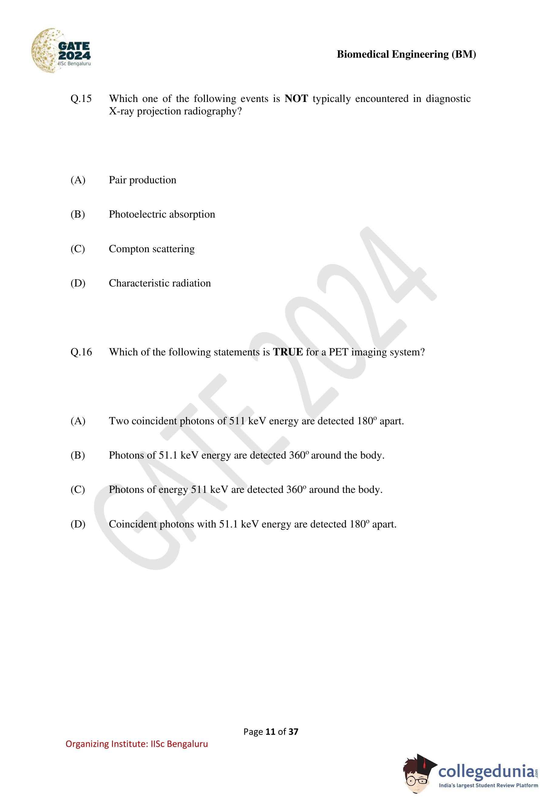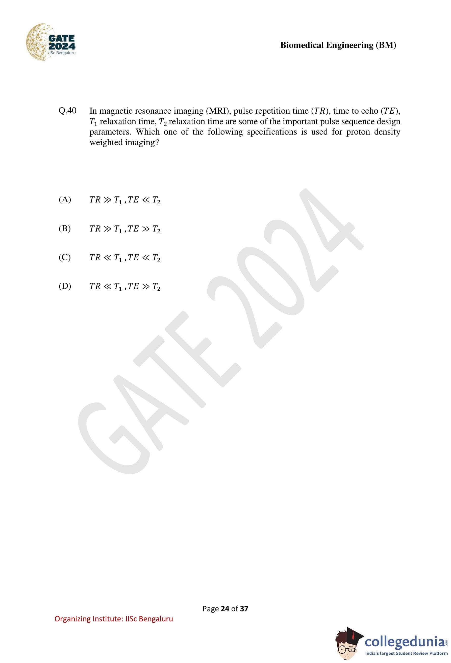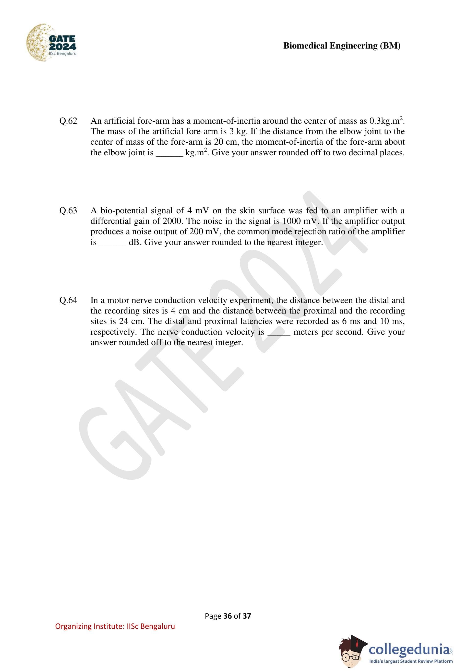 GATE 2024 Biomedical Engineering Question Paper PDF is available here. IISc Banglore conducted GATE 2024 Biomedical Engineering exam on February 4 in the Forenoon Session from 9:30 AM to 12:30 PM. Students have to answer 65 questions in GATE 2024 Biomedical Engineering Question Paper carrying a total weightage of 100 marks. 10 questions are from the General Aptitude section and 55 questions are from Engineering Mathematics and Core Discipline.